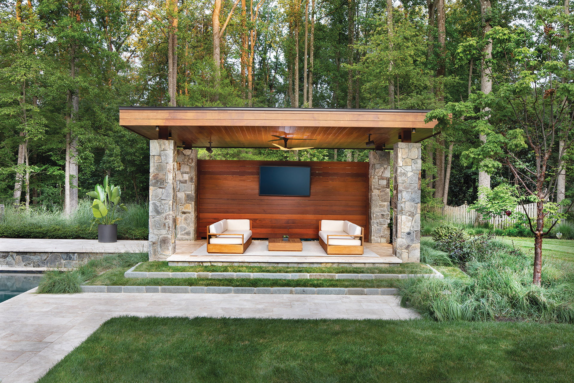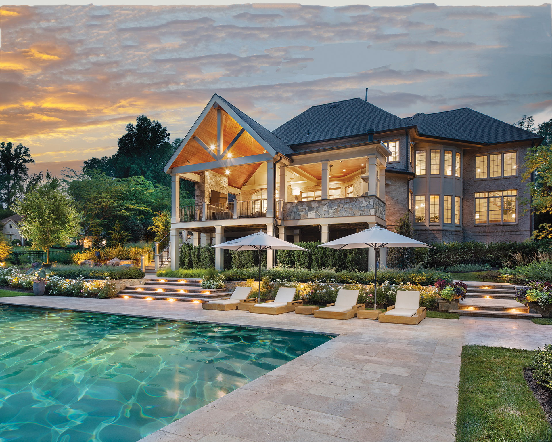 Hired to mastermind a backyard upgrade in Great Falls, Virginia, landscape architect Chad Talton of Surrounds, Inc., first demolished an existing pool and deck to make way for an elegant outdoor living area with a new swimming pool and plenty of space for entertaining.