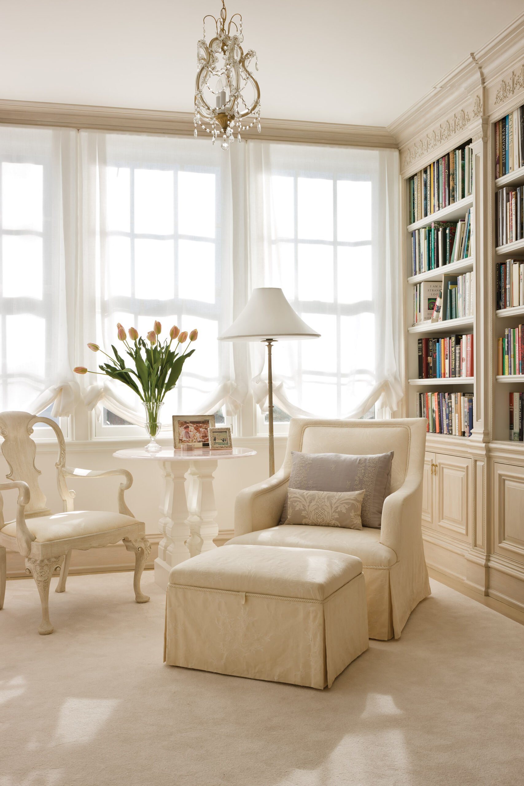 Lounge Chair & Ottoman: Custom. Side Chair: Clients’ collection. Table & Floor Lamp: Clients’ collection. Rug: galleriacarpets.com. Chandelier: Vintage. Drapery Fabric: romo.com. Drapery Fabrication: Potomac Draperies; 240-676-3642. Built-in Design: solisbetancourt.com. Paint: Snowfall White by benjaminmoore.com.