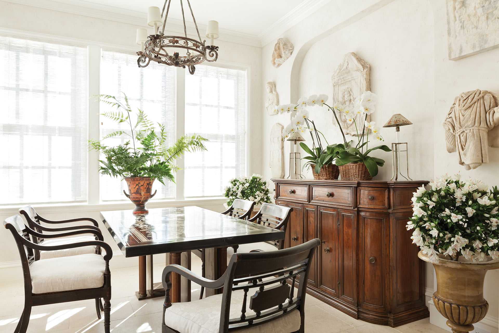 The creative vision for the gardenesque breakfast room included incorporating a group of hefty stone antiquities into the wall architecturally—a tricky structural maneuver. The result speaks volumes about the designers’ reverence for the familiar collection as a whole—not to mention the 30-year client relationship that corresponds with it.