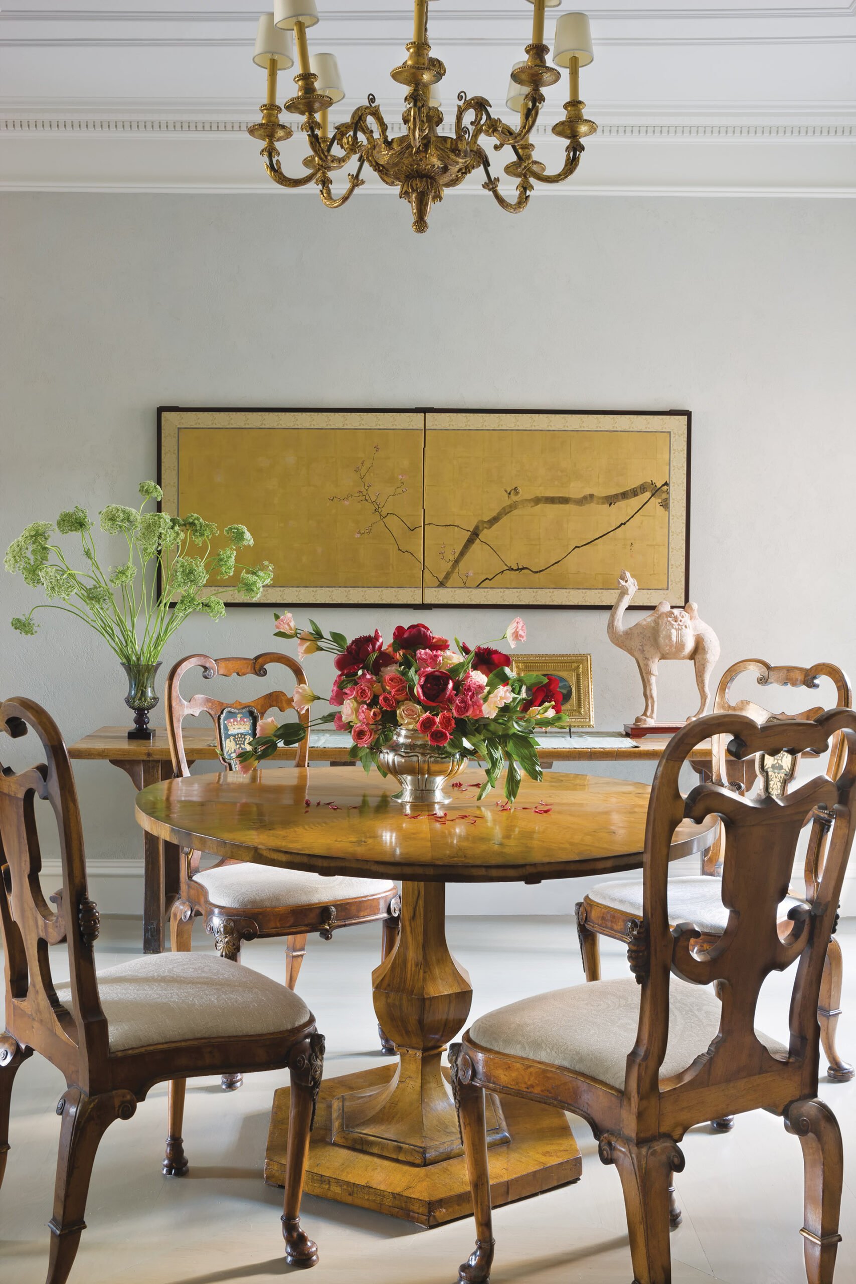 The 19th-century George I dining room chairs were re-covered in a fresh Ralph Lauren fabric.
