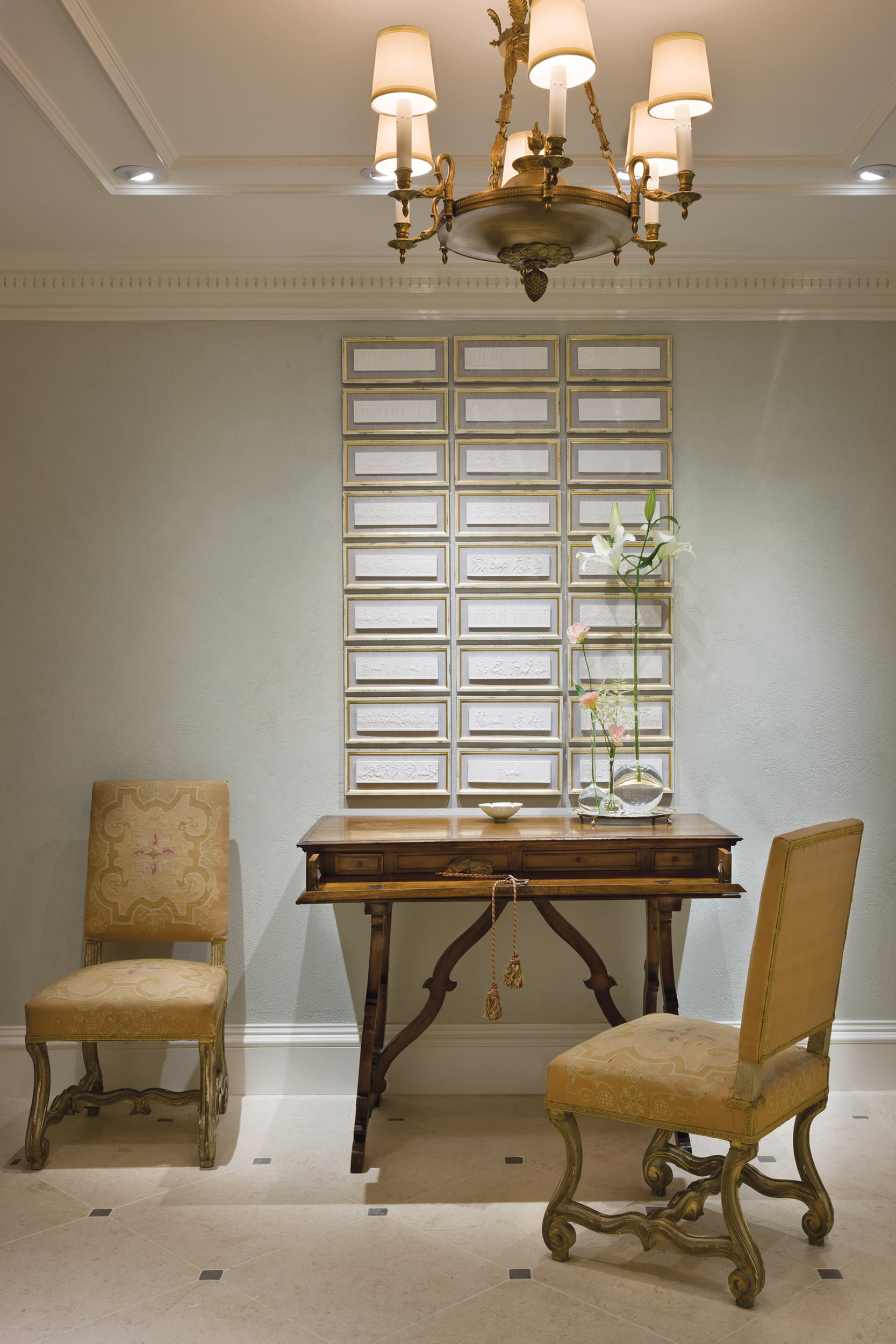Table: Clients’ collection. Chairs: Antique. Fabric on Chairs: ralphlaurenhome.com. Wall Finish: valleycraftsmen.com. Console & Screen: Clients’ collection