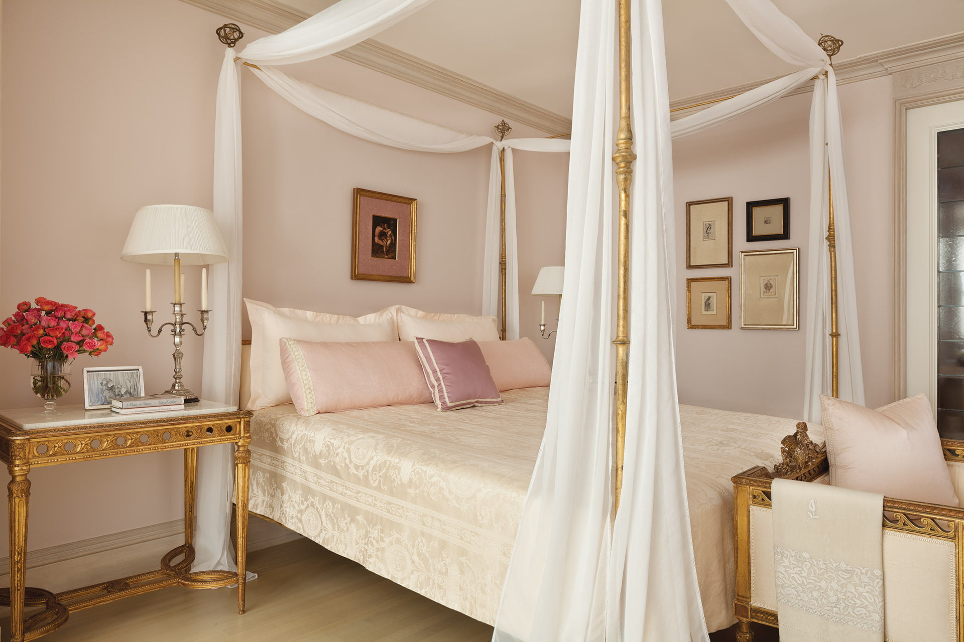 Solis Betancourt designed the gilt four-poster bed for the owner's previous home; in its Kalorama incarnation, the designers have added a diaphanous drape.