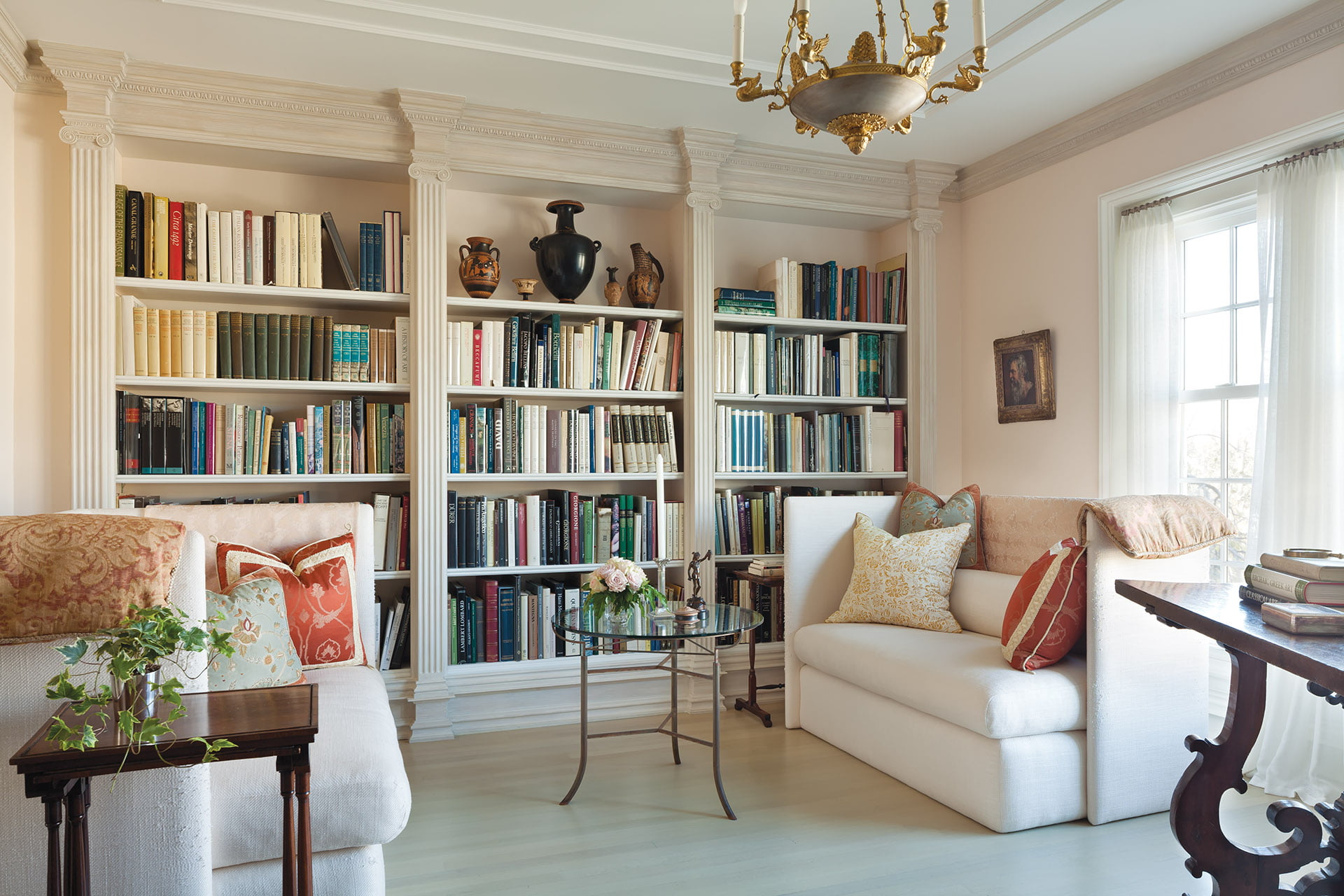New moldings and other millwork add refinement throughout, in keeping with the home’s classically inspired exterior architecture. “The interiors sort of lagged behind the style of the exterior,” recounts Sherrill. “We took the classical façade as a jumping-off point and developed the interior architecture to support that.” For example, fluted pilasters with Ionic capitals adorn the library’s built-in cabinetry. In sum, he notes: “It’s an understandable backdrop for a Grand Tour collection.”