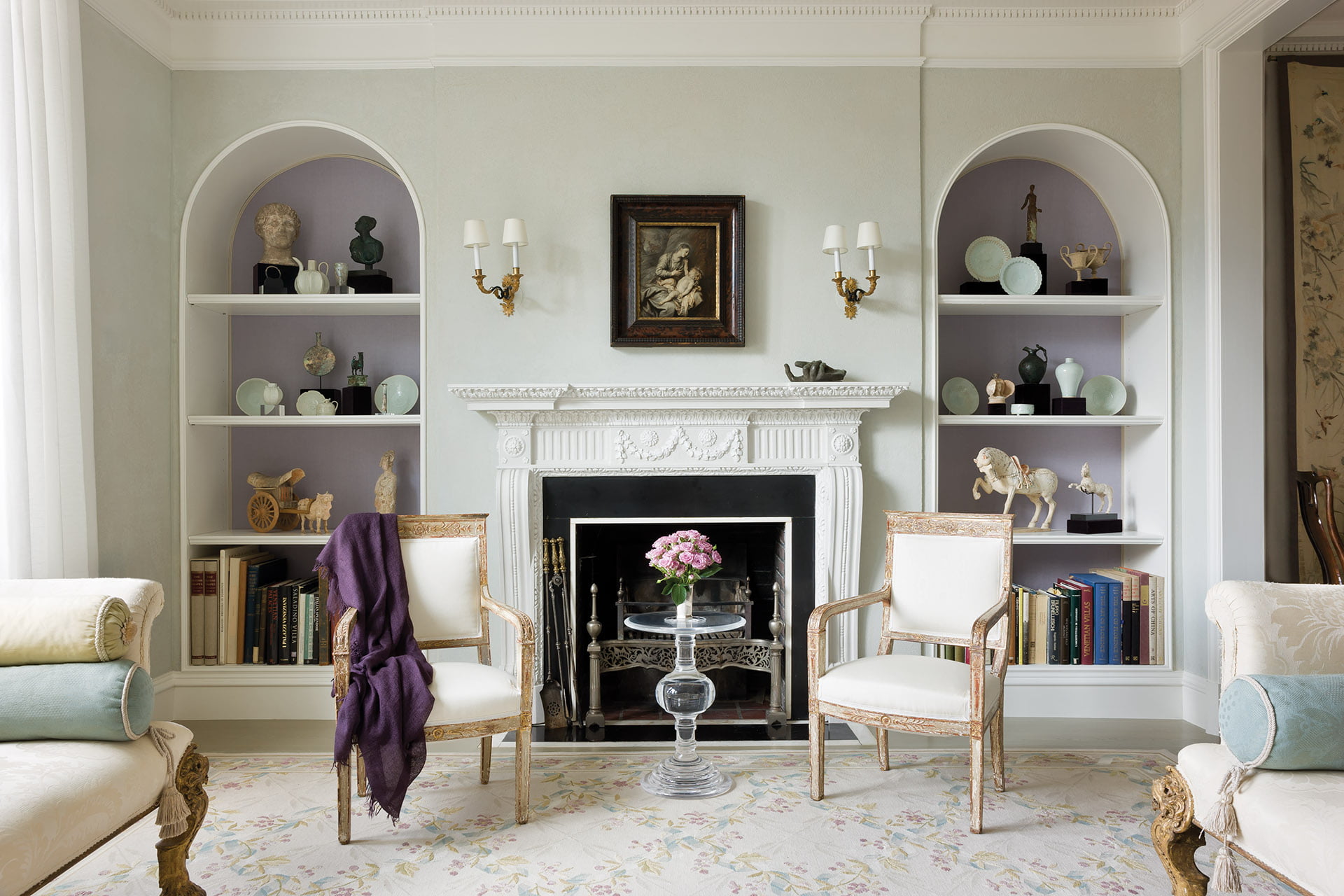 The team retained the living room’s ornate mantel but simplified trim on the niches flanking it and painted their backs a lavender hue.