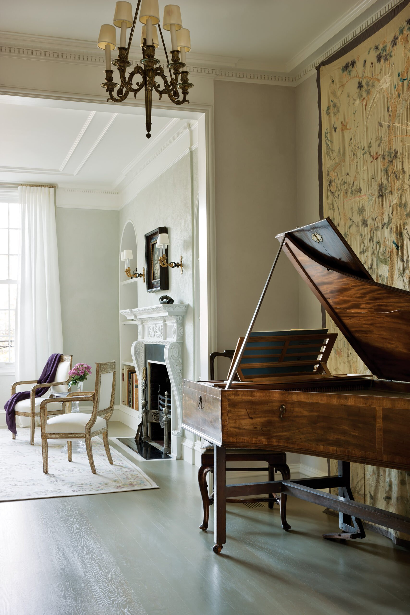 Desk: Antique. Chairs: Clients’ collection. Paint: Marmorino Plaster through valleycraftsmen.com. Chandelier: Clients’ collection. Chair: Antique. Paint: Marmorino Plaster through valleycraftsmen.com. Harpsichord: Antique.