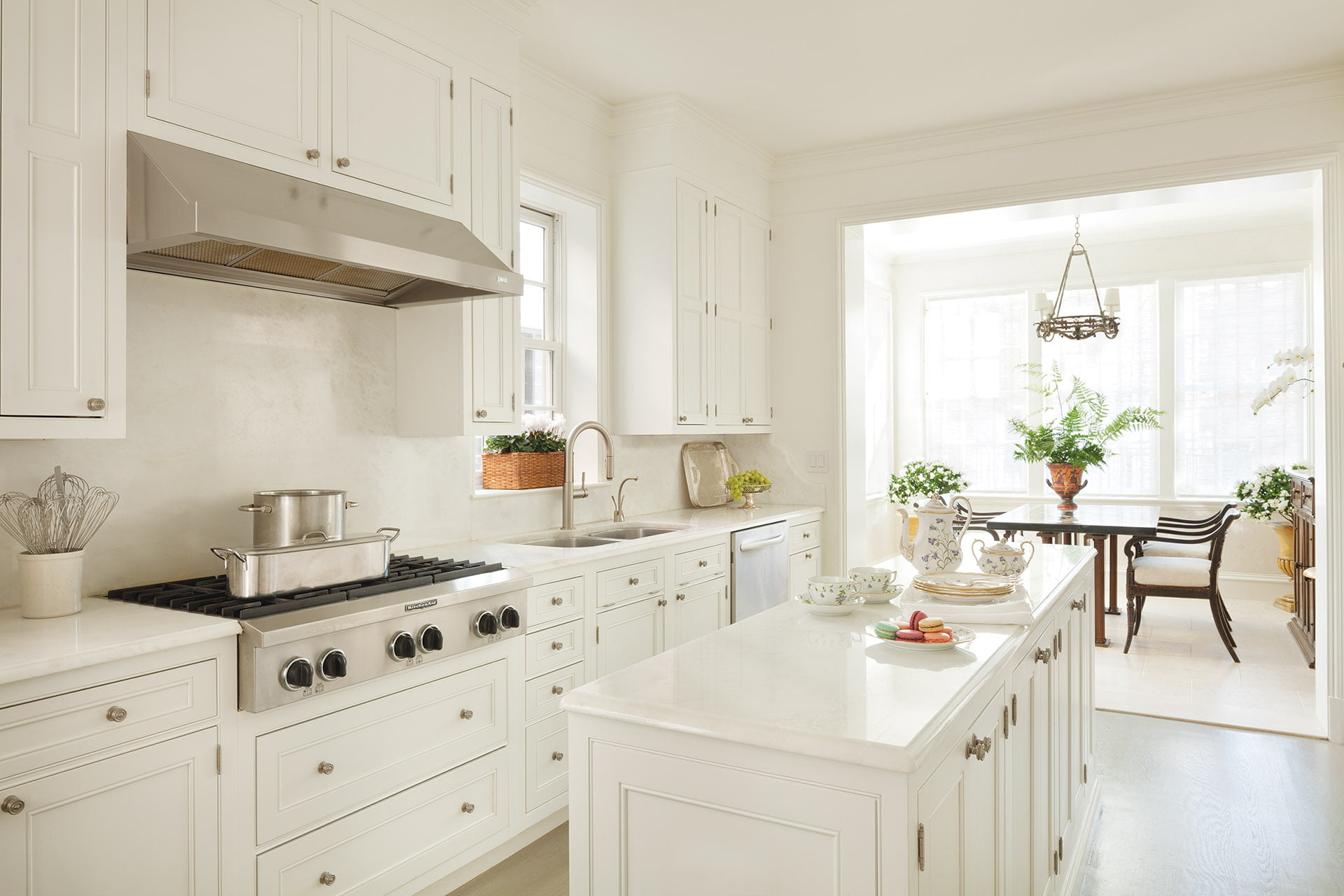 A Marmorino plaster finish, applied on most of the public-area walls by The Valley Craftsmen, “gives gravitas to the architecture,” Sherrill continues, while subtly shifting tints of blue and green unify the spaces. “We kept the palette one that would be more reflective of natural light,” he states. Light-enhancing materials, such as the kitchen’s Mystery White marble countertops and the breakfast room’s limestone floor, enhance the sense of airiness.