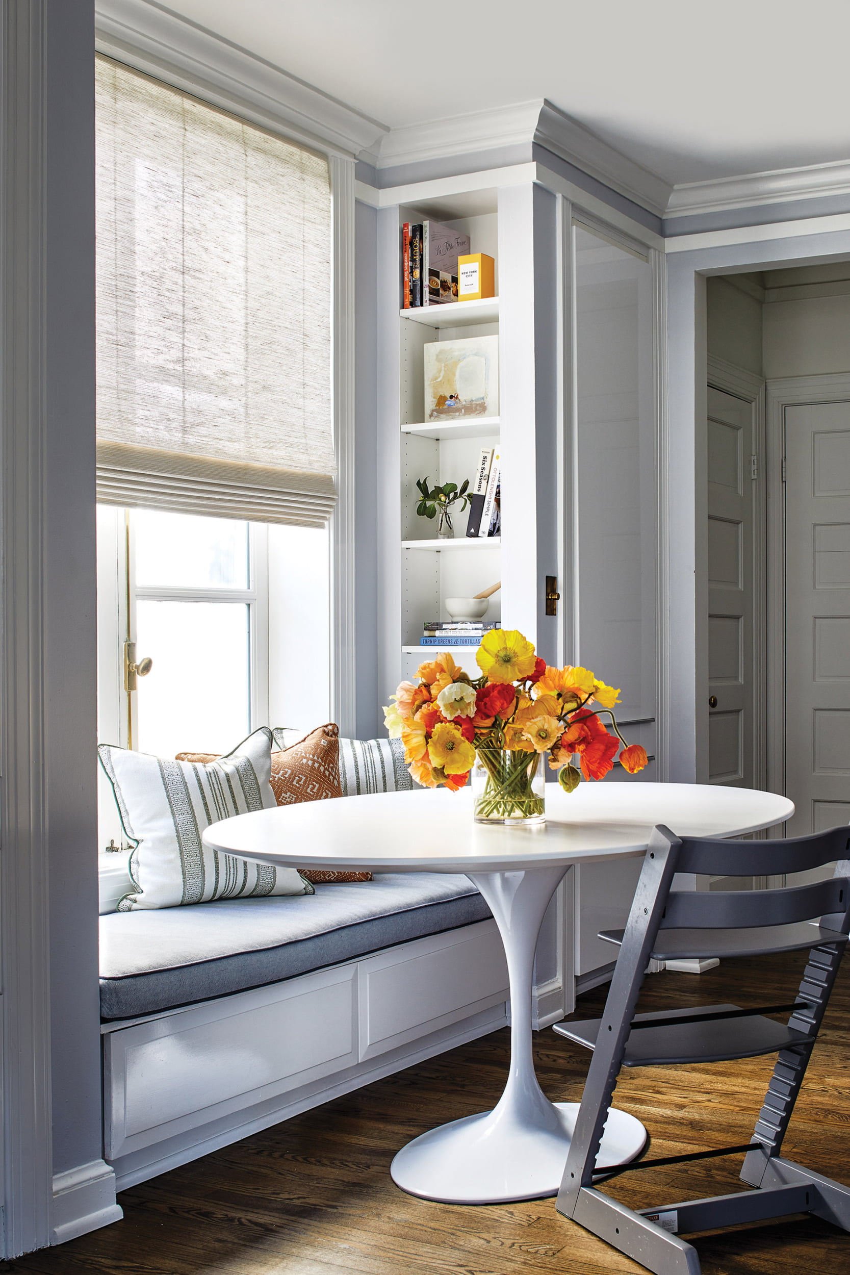 Pulliam painted the kitchen millwork and created a cushion for the window seat in pretreated Schumacher chambray.
