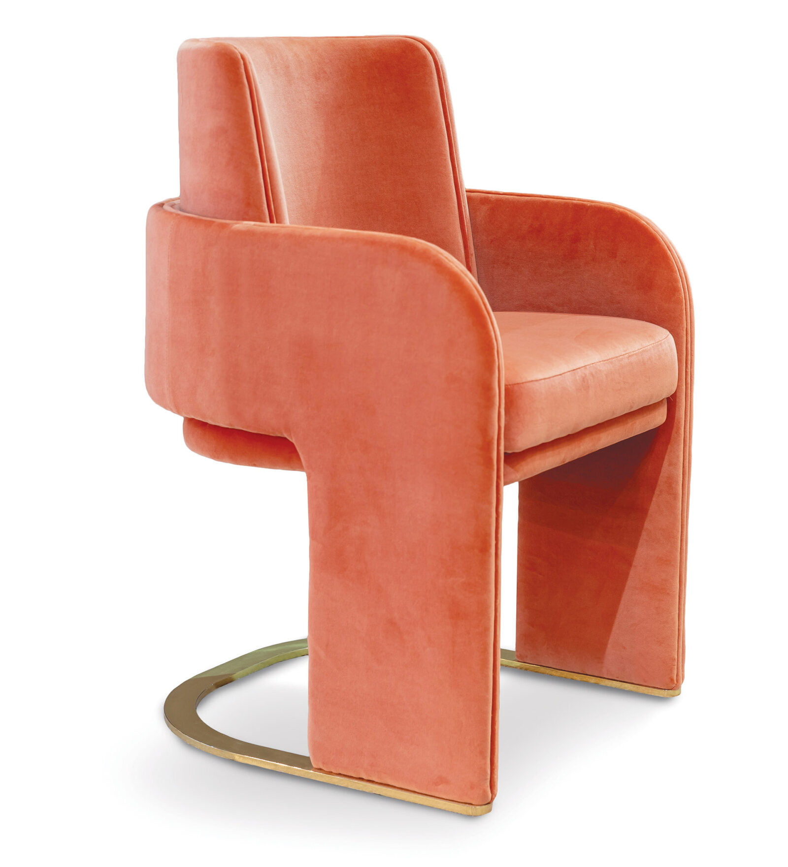 CHIC COMBO Hailing from Lisbon, furniture maker Dooq marries a range of materials, from velvet and straw to copper and marble, to create chic furnishings. Pictured: The Odisseia chair perches a plush, cantilevered seat atop a base of polished or satin brass, copper or nickel. Available in fabric or leather. dooqdetails.com |