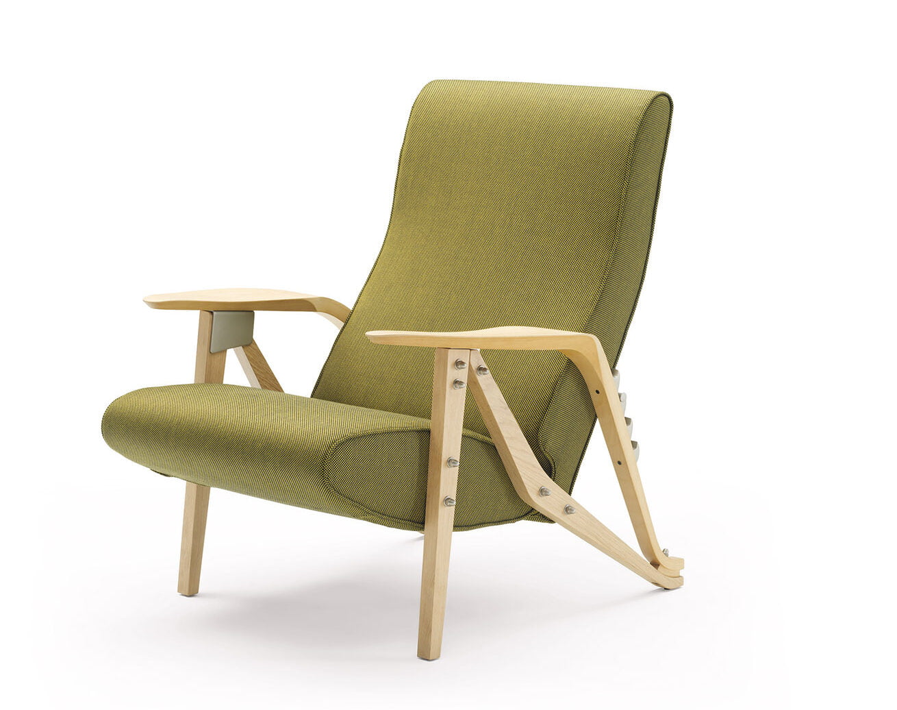 MEMORY LANE Zanotta has reissued the Gilda armchair, originally designed in 1953 by Italian architect Carlo Mollino. The ergonomically shaped recliner incorporates a padded seat and adjustable back, covered in fabric or leather. The frame, in oak or walnut, is embellished with nickel or brass accents in a satin finish. zanotta.com |