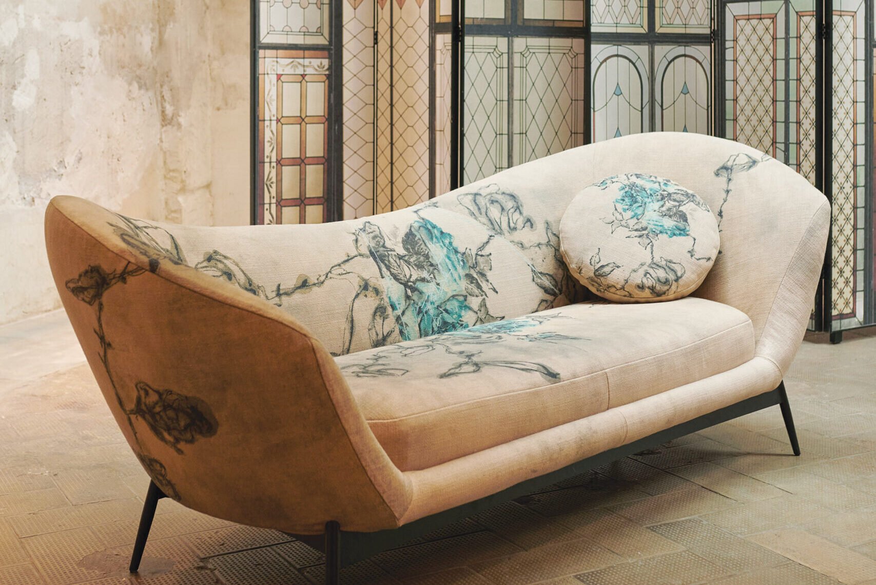 SINUOUS SHAPE An asymmetrical silhouette defines Oltremare, a collection conceived by Antonio Marras for Italian maker Saba. A slim, varnished-metal base supports a polyurethane-foam seat with a host of upholstery options; the sofa is pictured here in a handmade, recycled textile designed by Marras. sabaitalia.com |