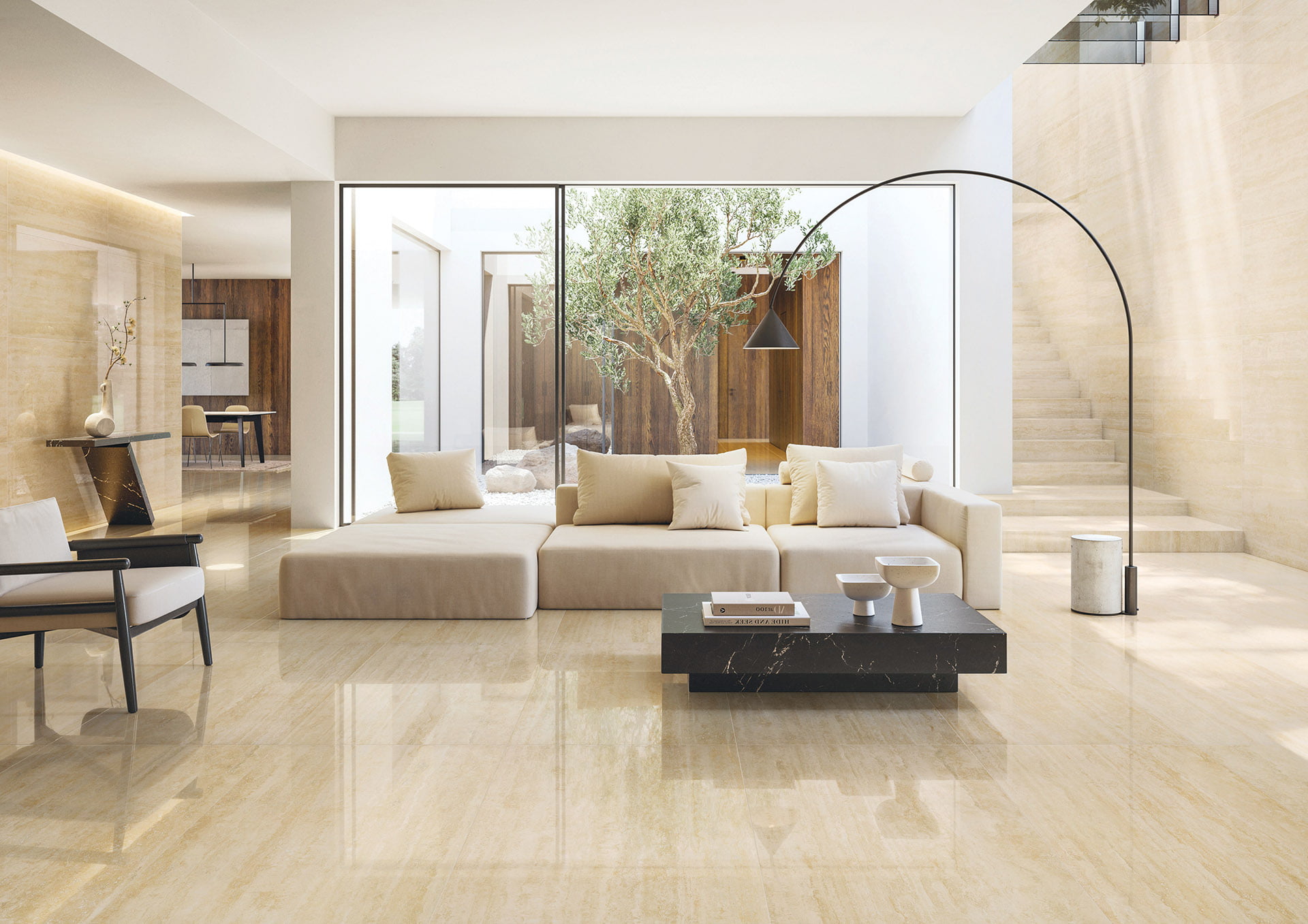STONE AGE Made in Italy, Ceramiche Refin’s Prestigio Travertino porcelain surfaces boast veining and tonal variations that mimic the look of natural stone. Find in decorative mosaics and large slabs that can be used indoors and out; the tile comes in Beige (pictured), Bianco and Grigio. refin-ceramic-tiles.com |