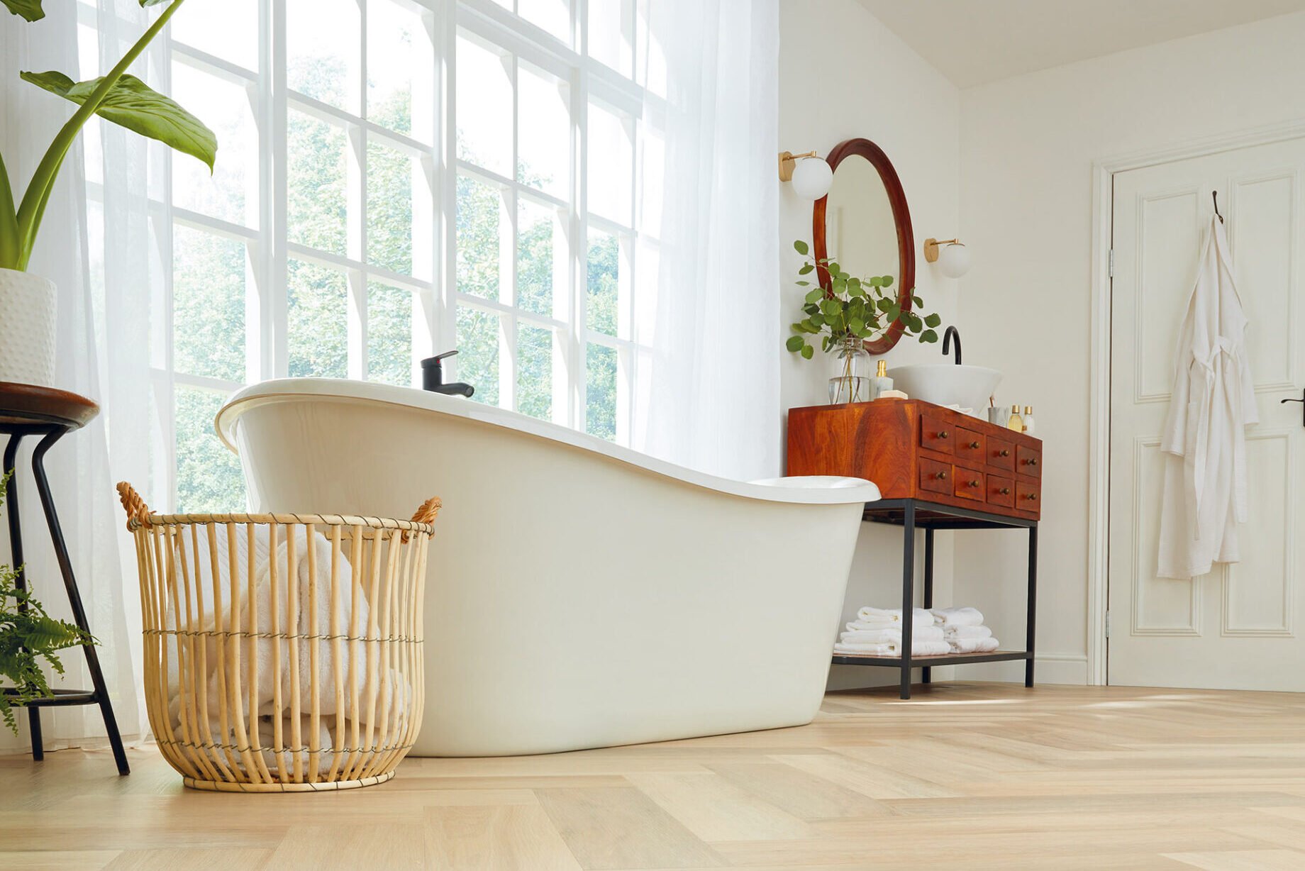 GEOMETRY AFOOT Inspired by hand-selected floorboards from an old railway station in the Scottish Highlands, Karndean’s Korlok Select vinyl flooring approximates the subtleties of wood grain. Among several colorways is Texas White Ash (pictured), which boasts a stylish herringbone pattern. karndean.com |