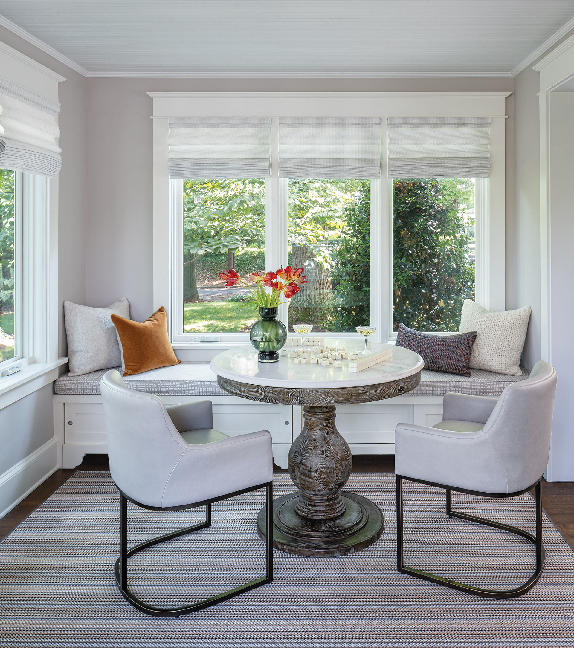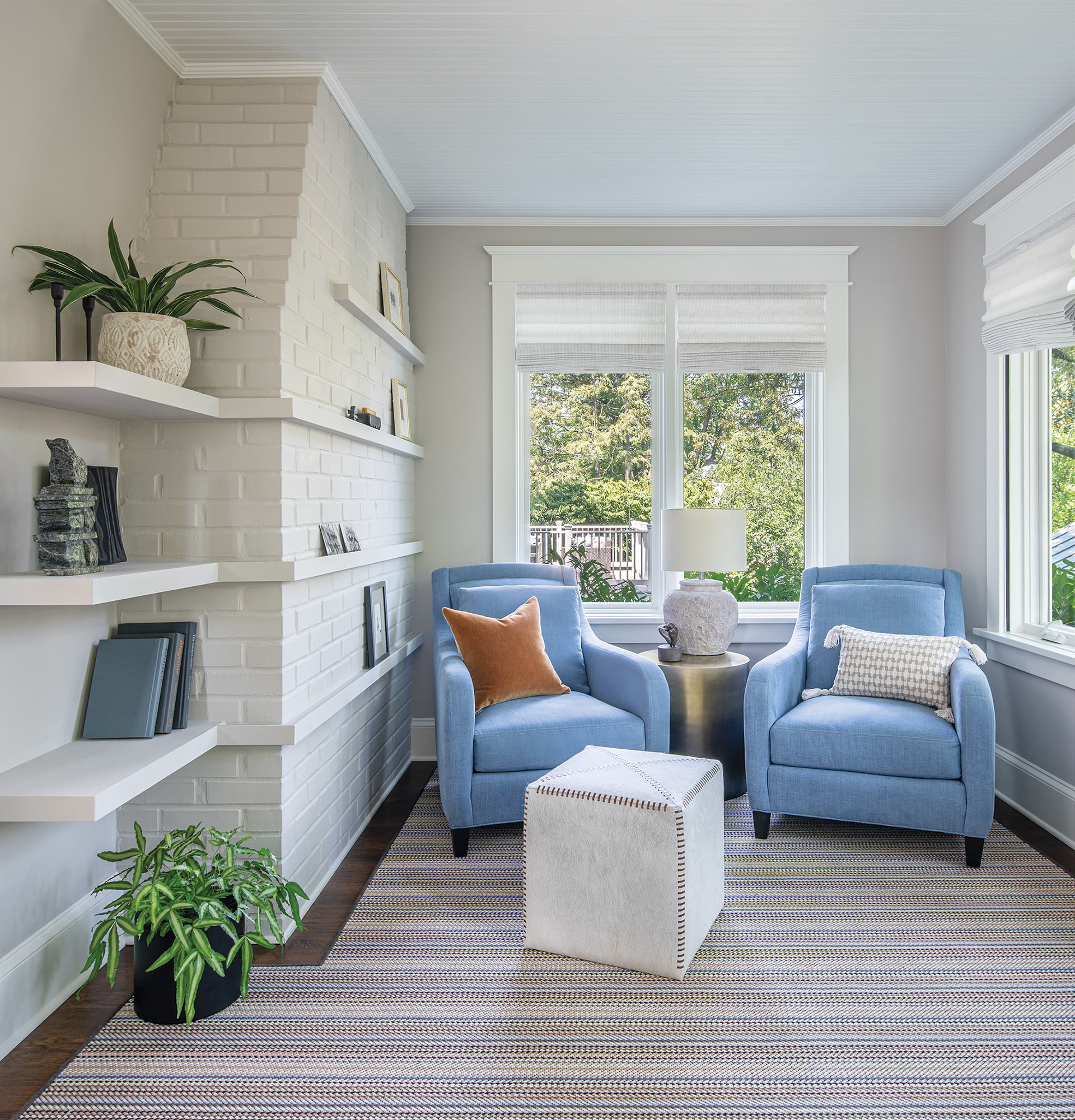A Chevy Chase couple with a charming, 1925 Sears kit house tapped BarnesVanze Architects and Alliance Builders for a whole-house remodel. Towards the end of the process, they enlisted designer Sarita Simpson of Interior Matter to work her magic on the interiors—which included what had been a screened porch. “It was finished out and turned into a year-round room,” Simpson relates. “The owners wanted a cozy space for reading and playing games with their kids.”