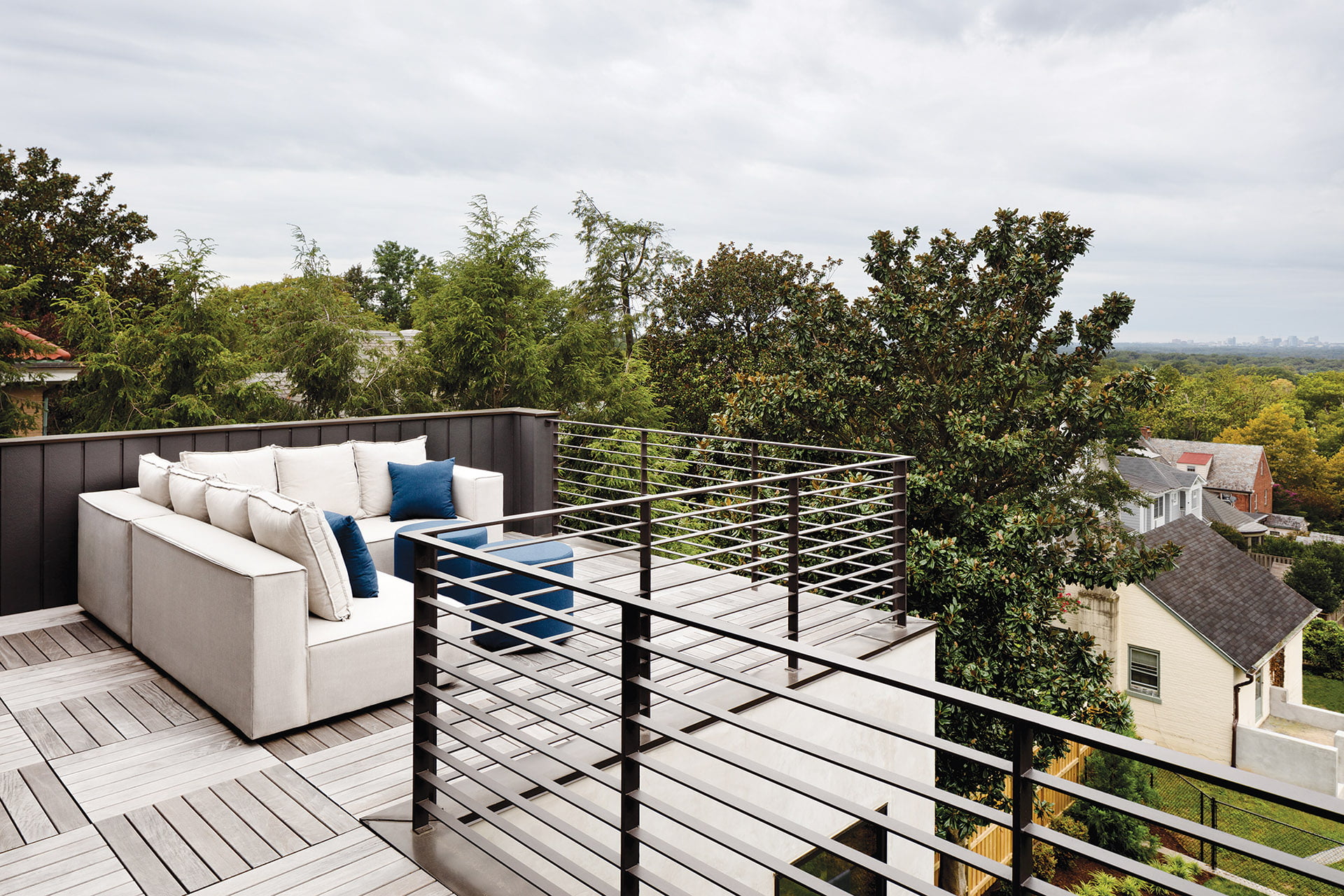 The expanded second floor boasts a large primary bedroom and sleek new bath, plus en-suite bedrooms for the kids; a laundry room; and a pair of hall closets for the couple. The new third level includes a guest room, full bath, the husband’s office/library and access to a deck offering drop-dead panoramas. “I can’t stop taking pictures of the amazing sunsets,” says the husband. The basement now includes a bedroom, bathroom, gym, mud room and laundry.