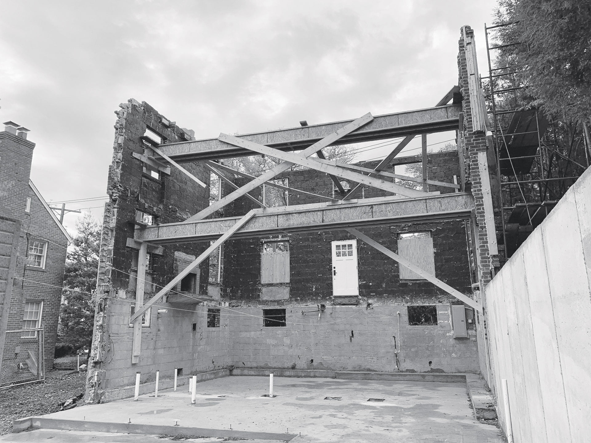 The architect teamed with contractor John Allen whose firm, AllenBuilt, Inc., overhauled the foundation and attached the surviving walls to new construction. “Metal rods were epoxied into the brick and then bolted to the wood framing,” Allen explains.