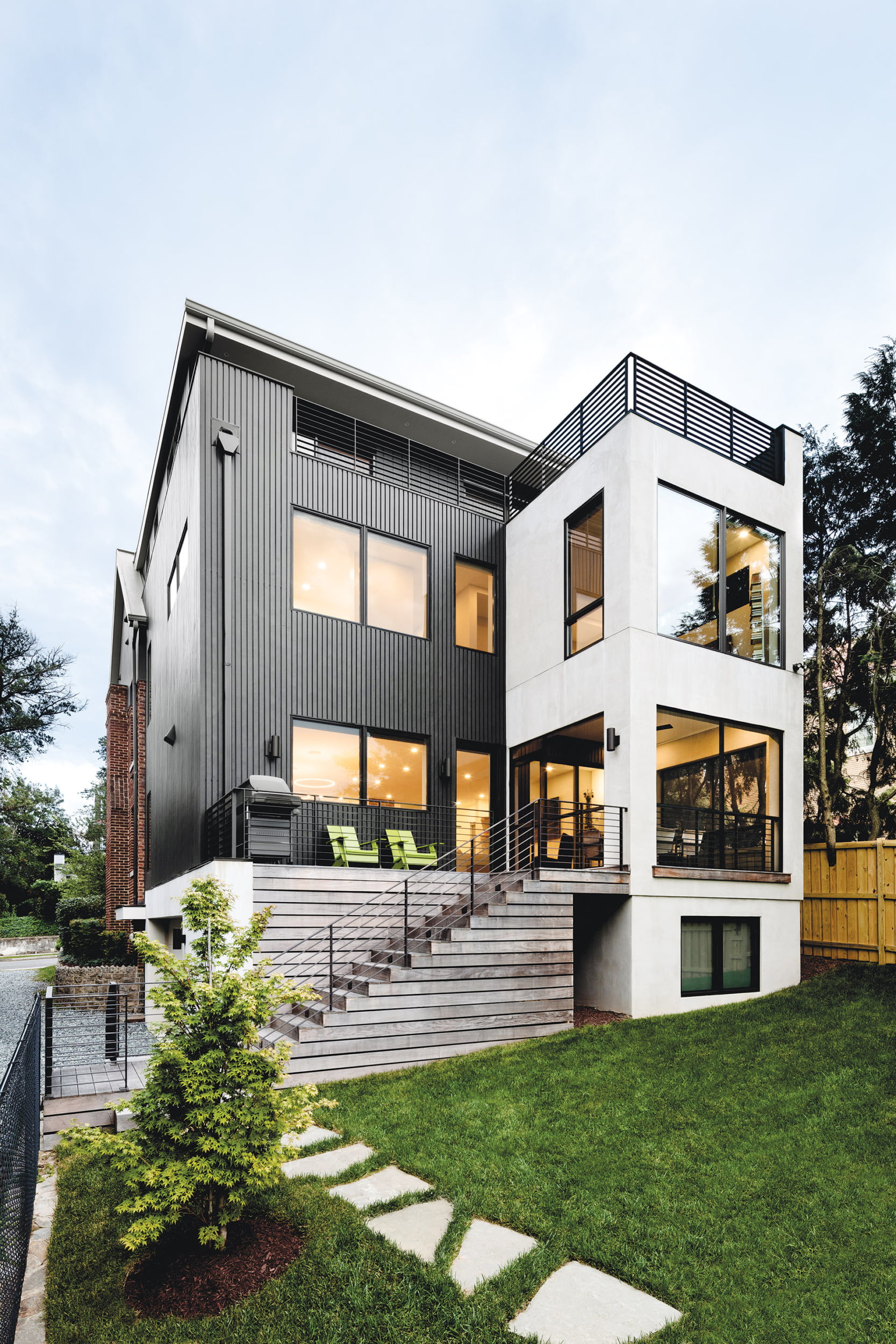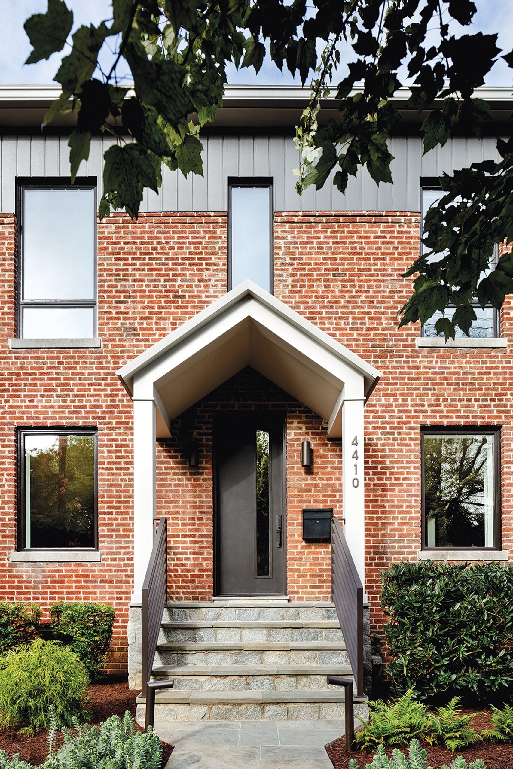 With its foundation correctly designed and executed, the home today is roughly the same 30-foot width as the original. The existing brick front has been subtly contemporized with minimalist, metal-framed Andersen windows and the same vertical, cement-board siding accenting the roofline. Meanwhile, its modern rear addition—clad in white stucco and vertical, steel-look cement-fiber-board slats—is intentionally concealed from the street of traditional dwellings.