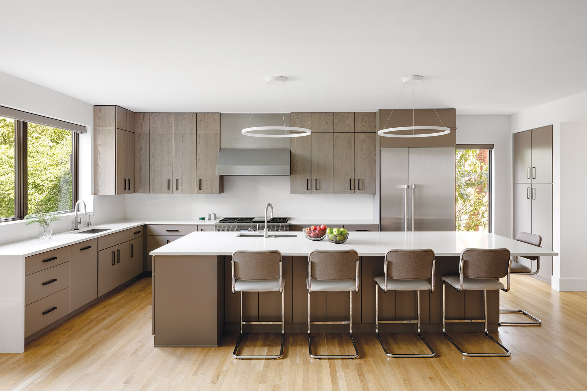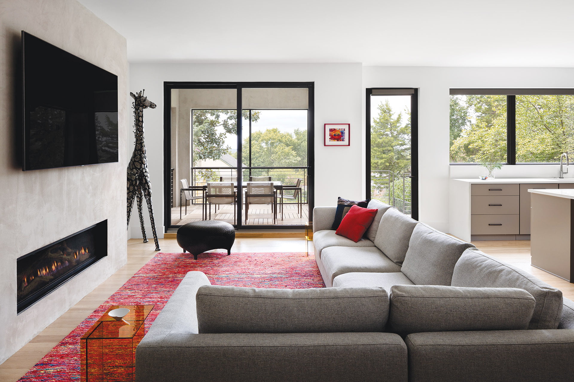 The main level of the addition encompasses the open kitchen/family room. Carle collaborated with Sugarloaf Kitchen & Cabinet Works on the expansive, streamlined kitchen featuring Kountry Kraft cabinets topped by white quartz counters. In the adjacent gathering space, a gas fireplace and flat-screen TV tucked into a ceiling-height stucco surround front an L-shaped sectional—the perfect spot for cozy movie nights. Glass doors open onto an inviting porch, partly screened for bug-free dining and partly open for grilling and chilling. The backyard—reachable by a staircase of ipe wood planks and steel railings—was leveled to accommodate a sport court.