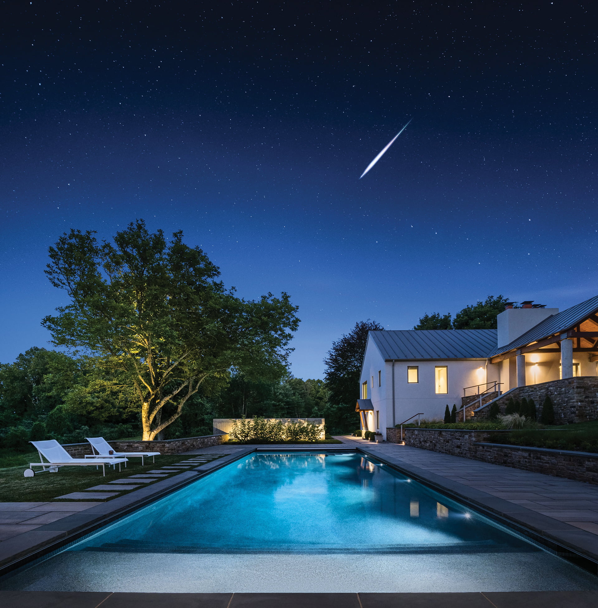 1. While masterminding a modern addition to an historic 17th-century, log-and-stone dwelling, its owner, an architect, tapped Colao & Peter to overhaul the landscape. “We created a private entrance gate with a circular driveway; renovated the swimming pool; devised a Japanese garden; and added masonry walls, steps and walkways, as well as plantings throughout the property,” recounts partner and landscape architect JR Peter. He and his design team employed stone in the landscape plan that complements both the addition and the original structure, creating a visual bridge between old and new.