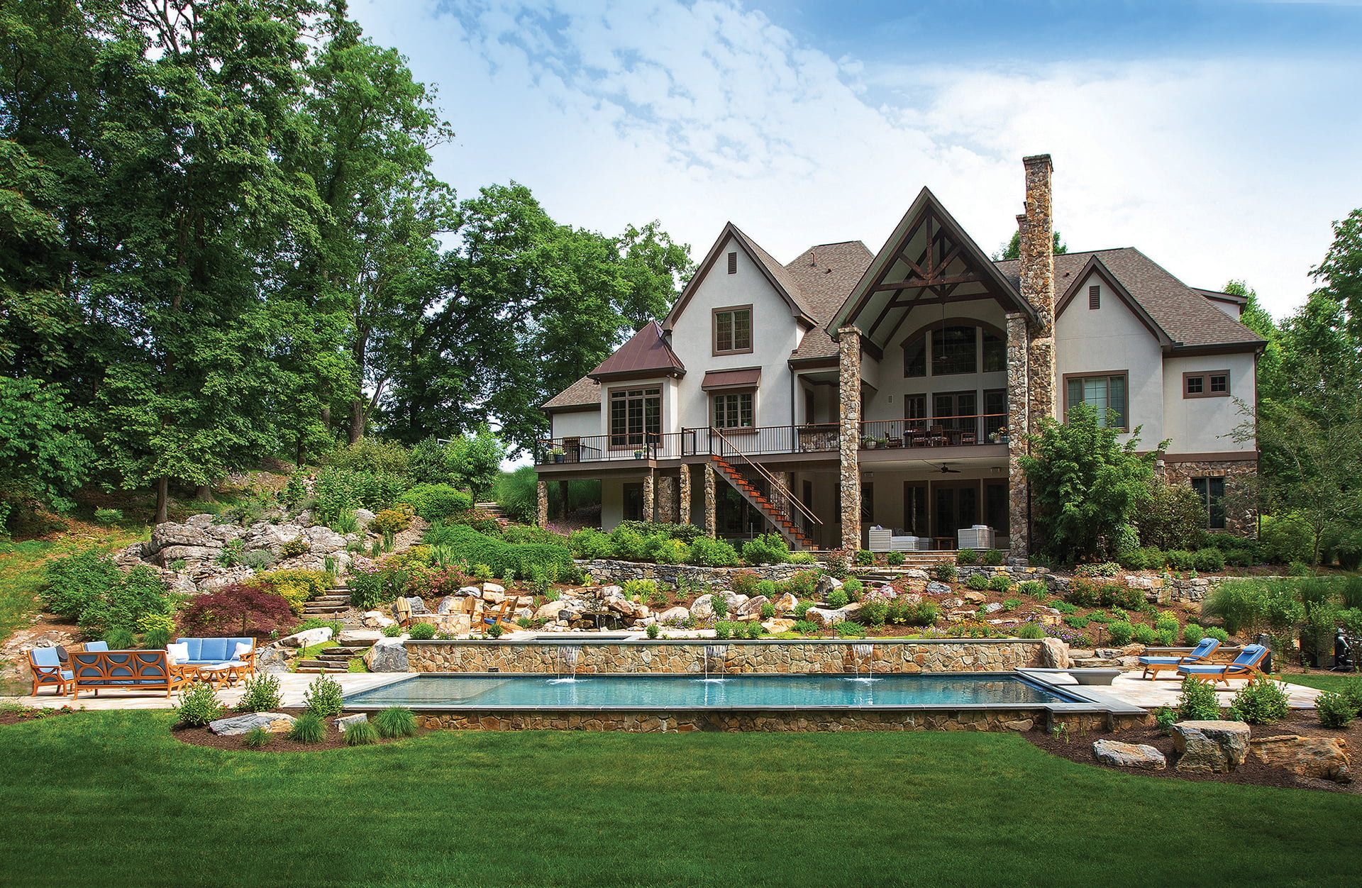 2. When creating a landscape to complement a lodge-style abode in Winchester, Virginia, Colao & Peter conjured the right look with a natural-look stone veneer and boulder accents. The finished project includes a pool, spa, pool deck, fire pit and hardscape.