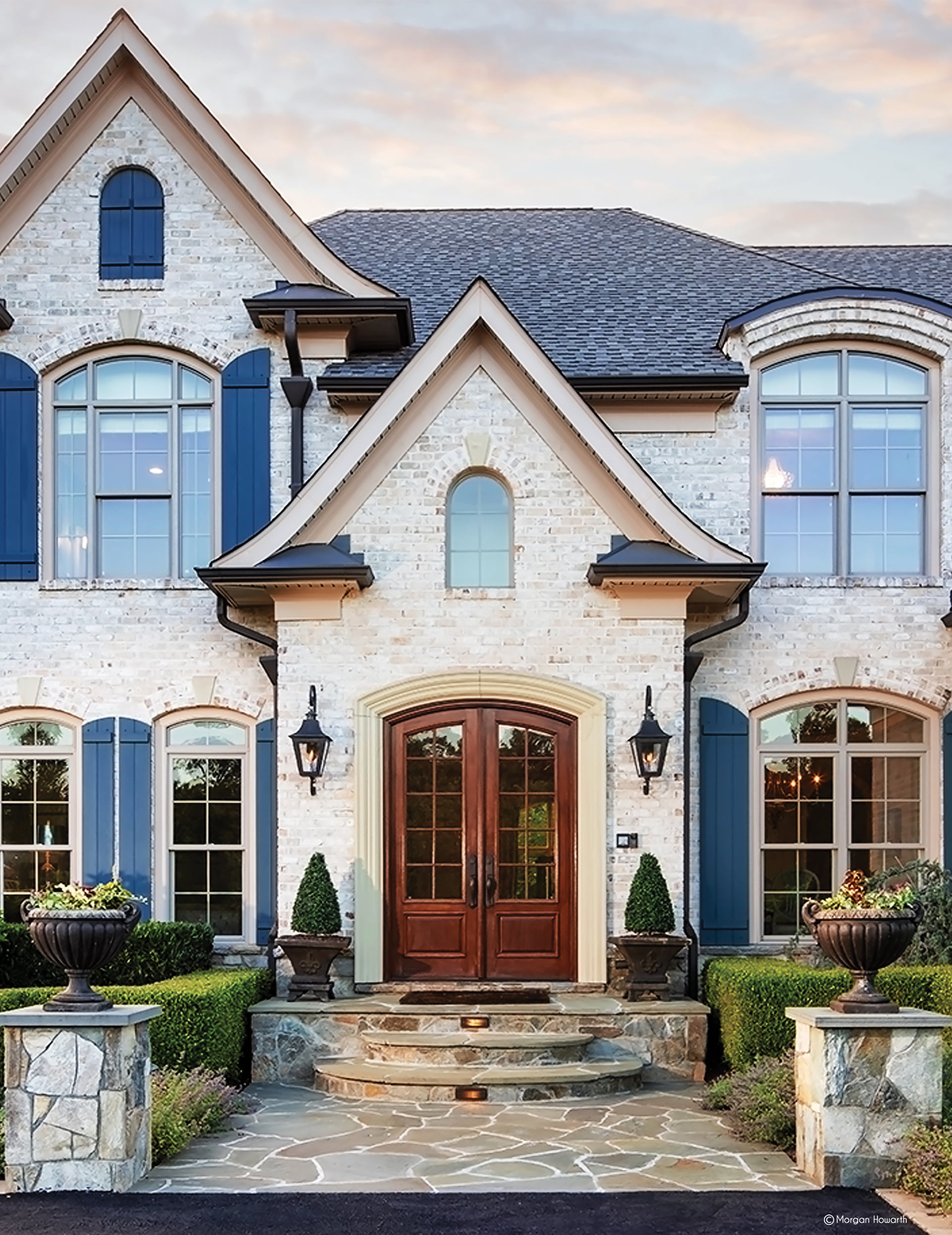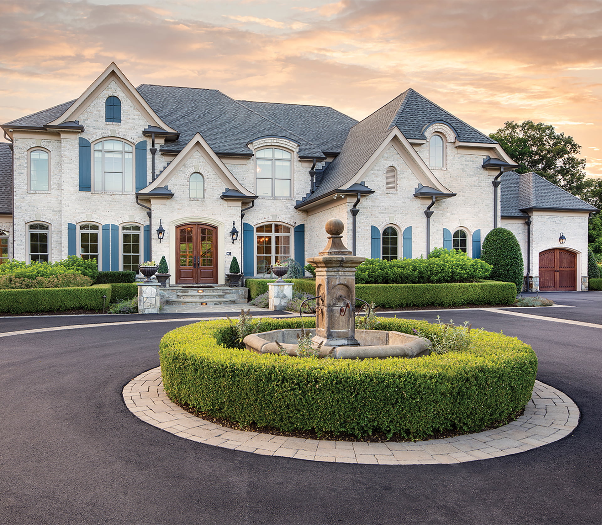 The design team created a new driveway approach and parking areas, including an extension that accommodates the garage and is screened by holly and crape myrtle. A fountain encircled by shrubbery aligns with the front door; walkways are clad in the same stone that trims the house. Plantings such as boxwood, hydrangea, laurel and cat mint are pruned to compliment the home’s formal architecture. Evergreens along the property lines conceal the neighboring houses.