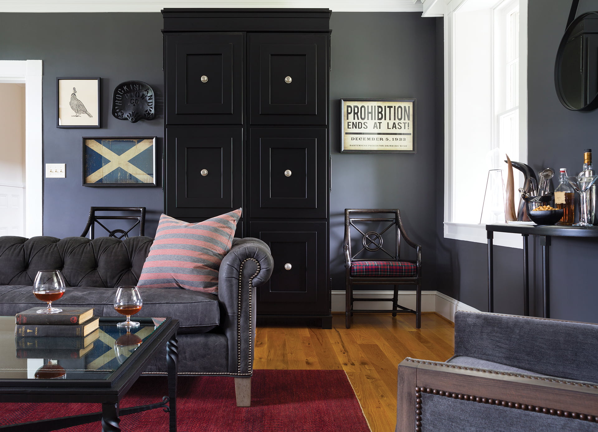 Dark gray walls turned a library into a moody oasis in a house filled with kids and pets; the leather Chesterfield sofa is from Wesley Hall.