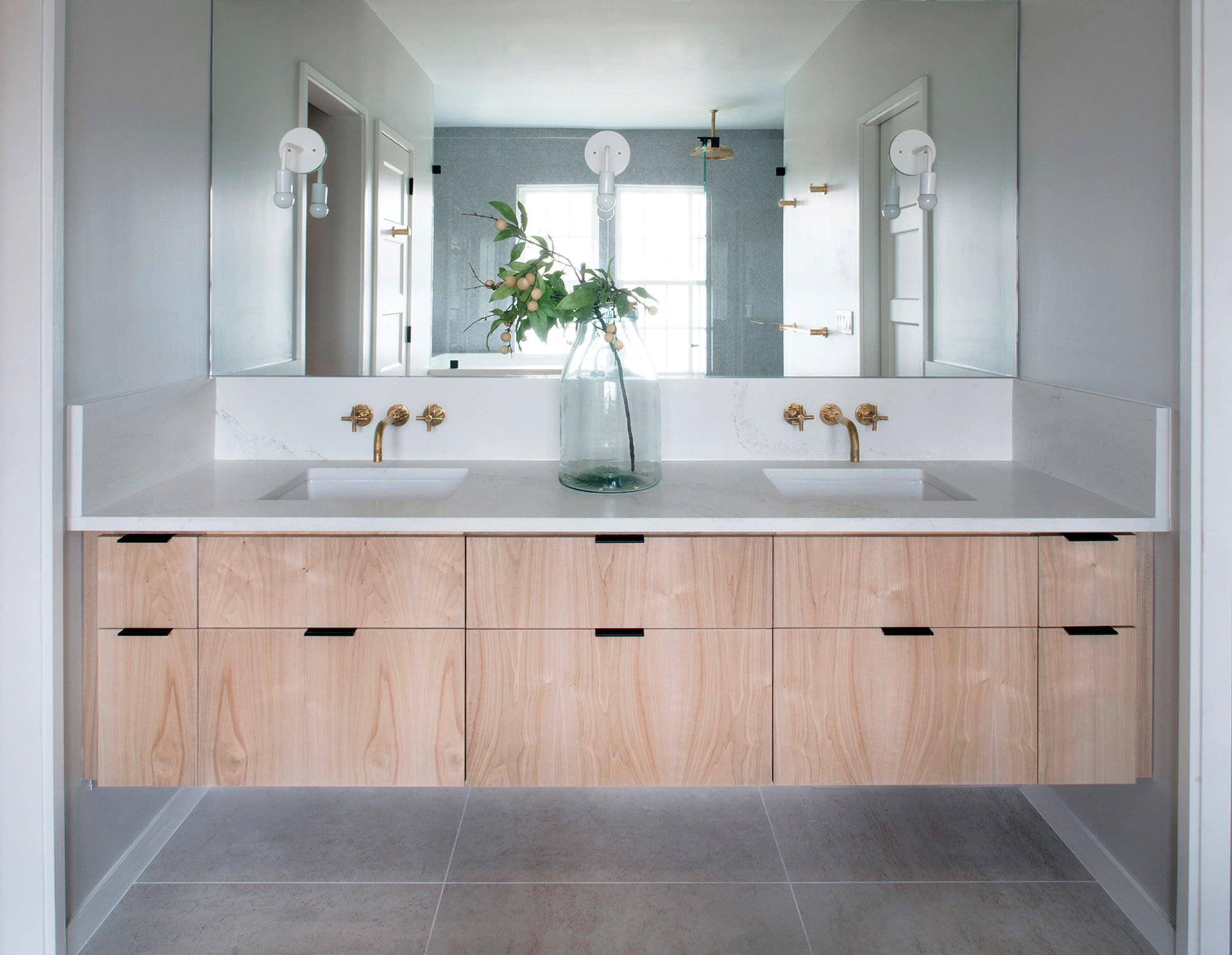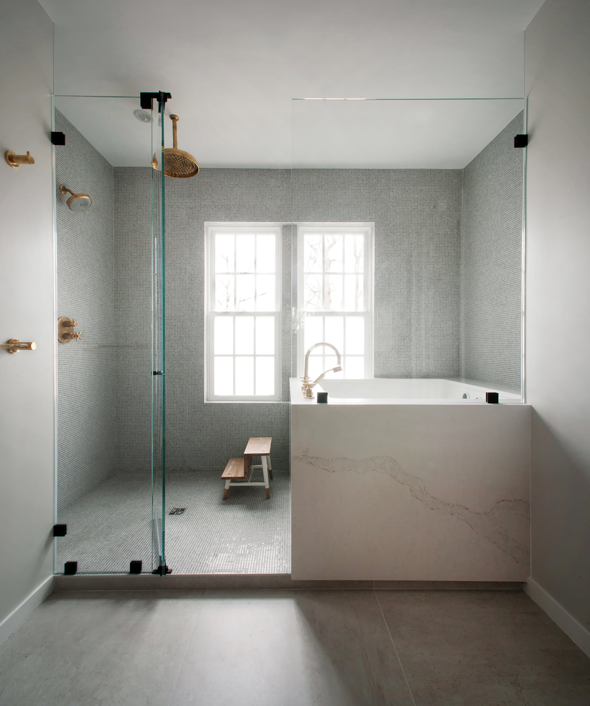 We like to create a fictional history for spaces that may be devoid of personality. Often we amp up crown molding or wall paneling to bring attention to a minimal, subtle moment. The addition of a patinaed plaster wall or a worn brick floor, for example, really highlights sleek new cabinetry.