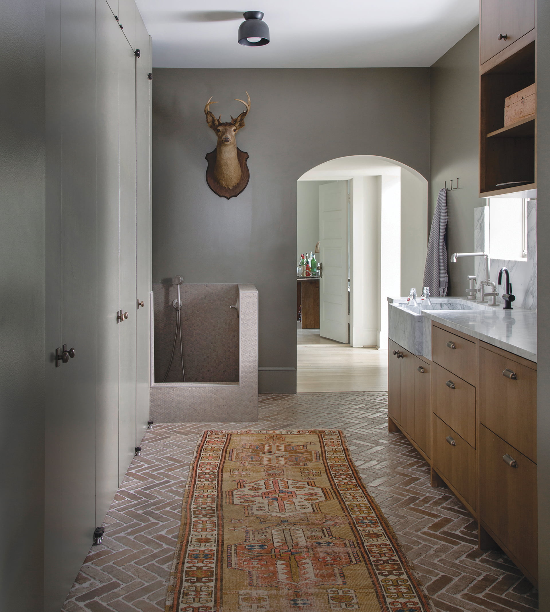 The butler’s pantry is an essential feature. Individual lighted closets secure backpacks, while custom cabinets by Ted Ferris hide snacks, refrigerator drawers and Michael’s prized pellet ice machine. The dog can pad about on the brick floor, or hop into a mosaic-tiled puppy spa under the watchful eye of a mounted trophy stag that conveyed with the house. A marble farm sink is sized for armfuls of flowers destined for the kitchen’s 13-by-5-foot, Caesarstone-topped island.