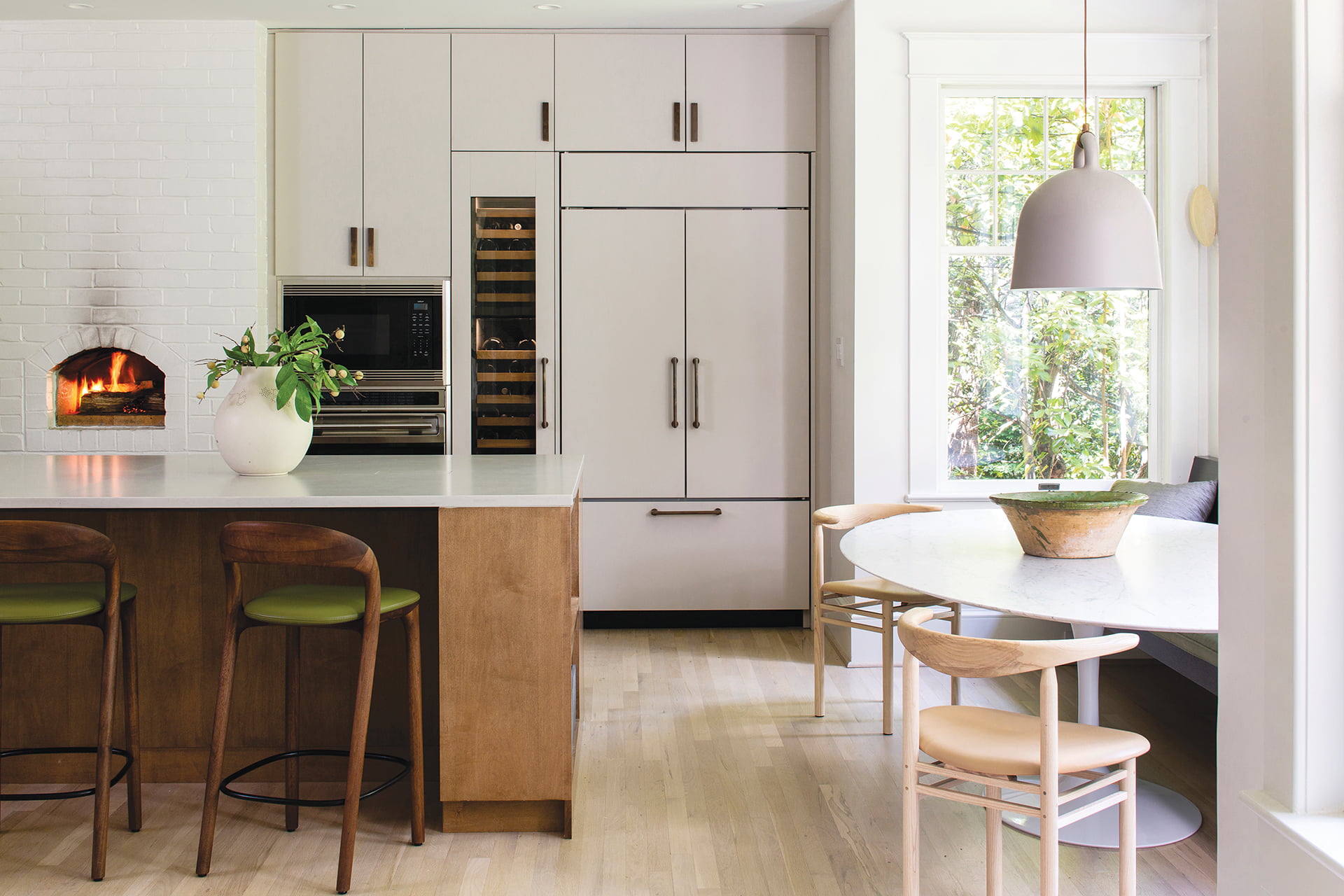 Once dominated by an oversized leather sofa, the space containing the kitchen boasts a Saarinen table and a custom banquette in a sunny alcove. A pizza oven built into the old fireplace supplements an array of reinstalled Wolf appliances. New, full-height windows and doors open to an existing terrace and a garden designed by Kelley Oklesson of Groundsmith Collective. A frosted-glass interior wall opens to the cook’s pantry.