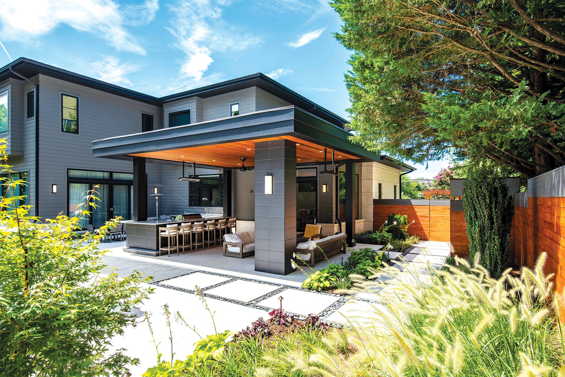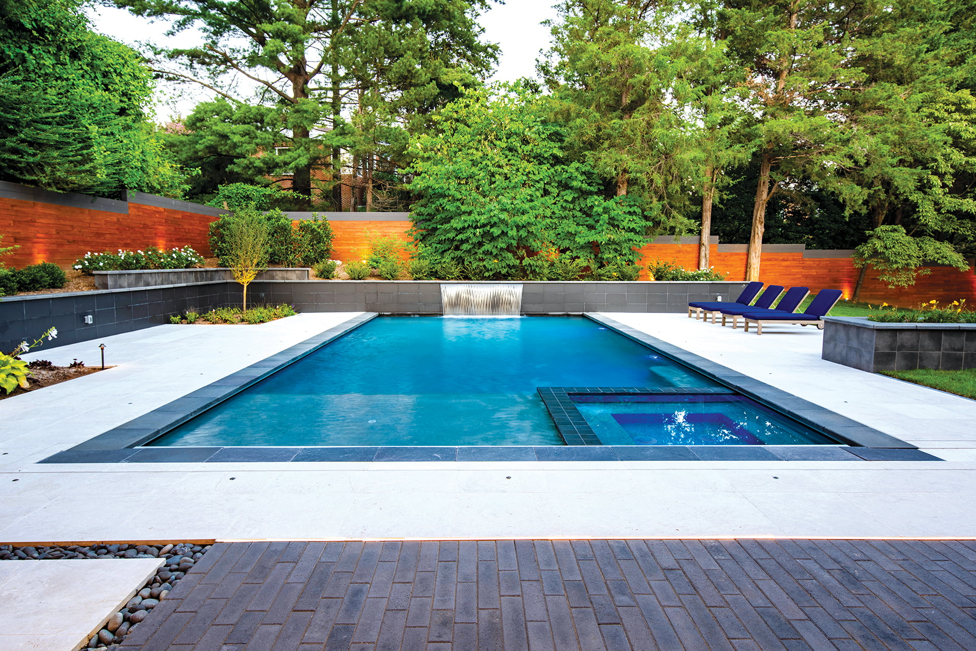 Pristine Acres devised an extensive plan for a compact lot in McLean, ensuring that the landscape would reflect the contemporary style of the newly built custom home on site. On the wish list: a swimming pool with a spa and sun shelf; a flat-roof pavilion housing a fire pit and outdoor kitchen; cedar fencing; and underground stormwater management. “Retaining walls are clad in porcelain tile to echo the architectural character of the home,” explains the landscape architect, Kevin Kurdziolek. A sheer-descent water feature anchors the pool scape.