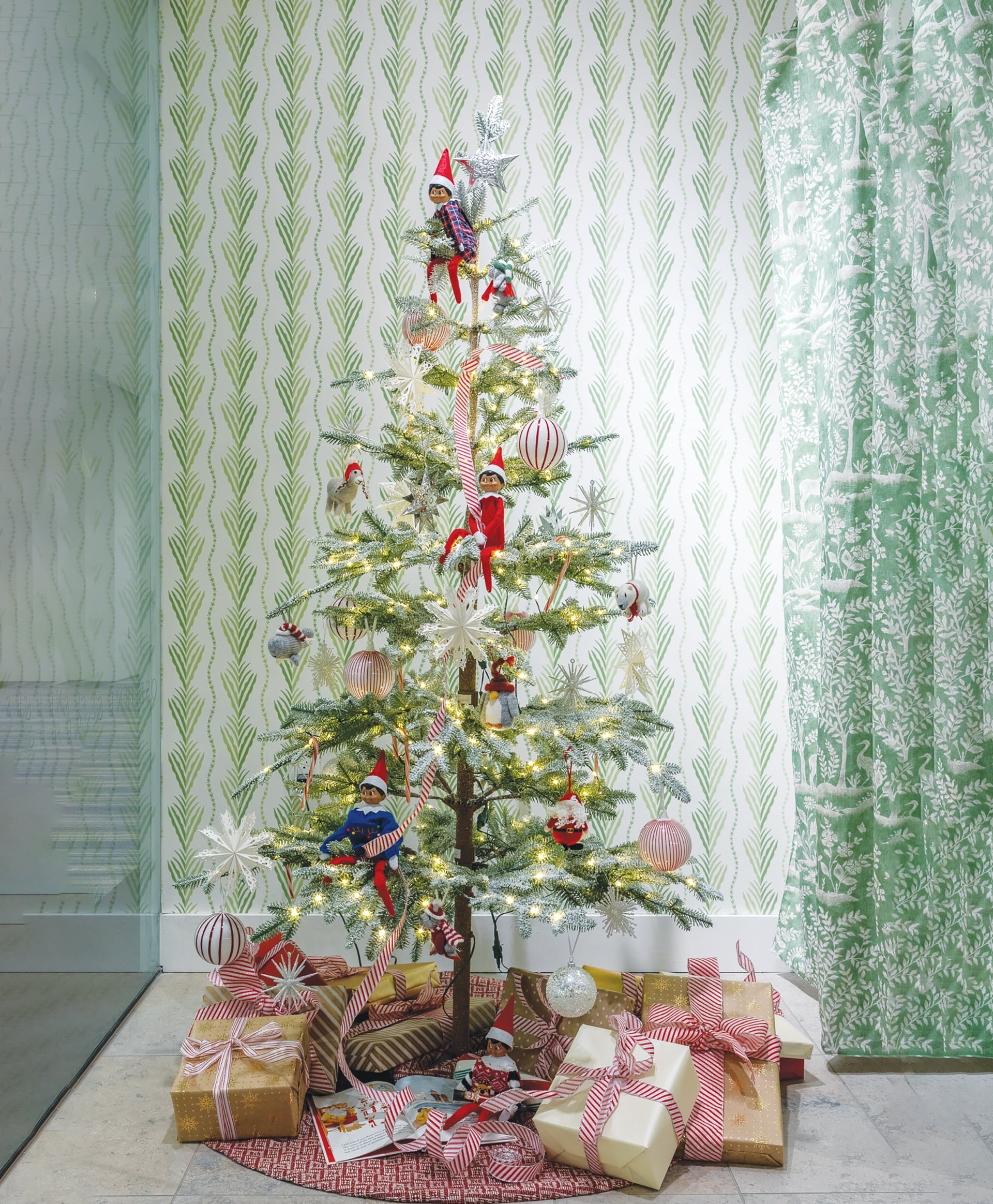 Azali Kassum Design's vignette in the Osborne & Little showroom featured Méridor wallpaper by Osborne & Little and a panel of Montsoreau Forêt fabric by Nina Campbell as a backdrop for a tree laden with elves.