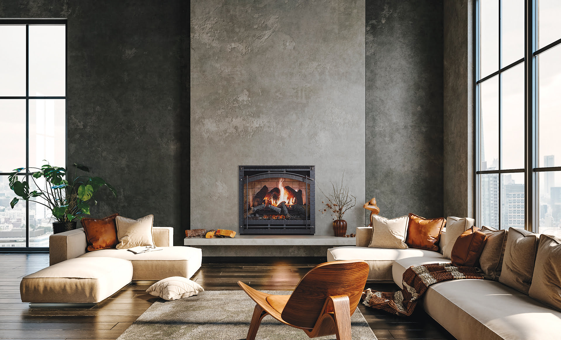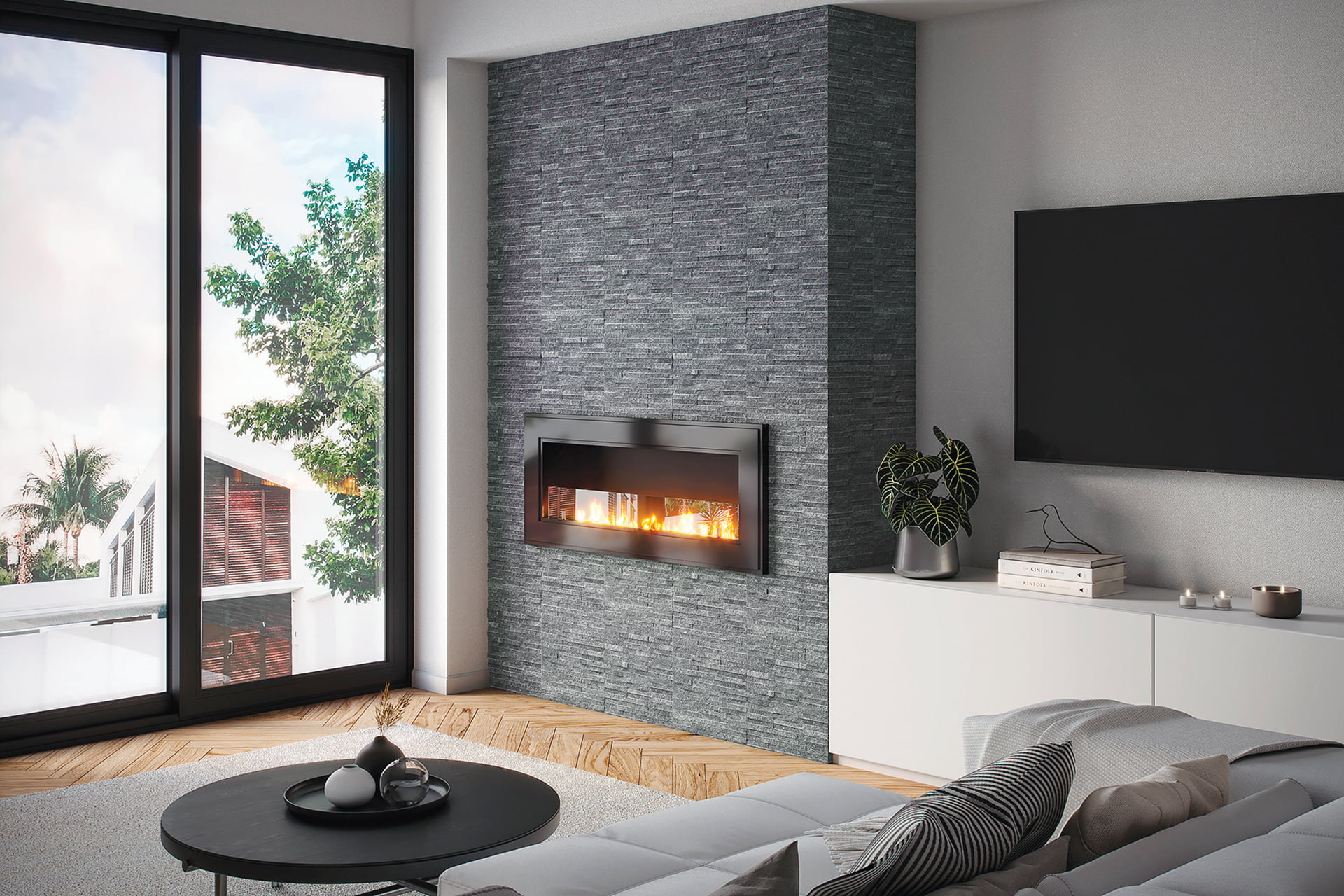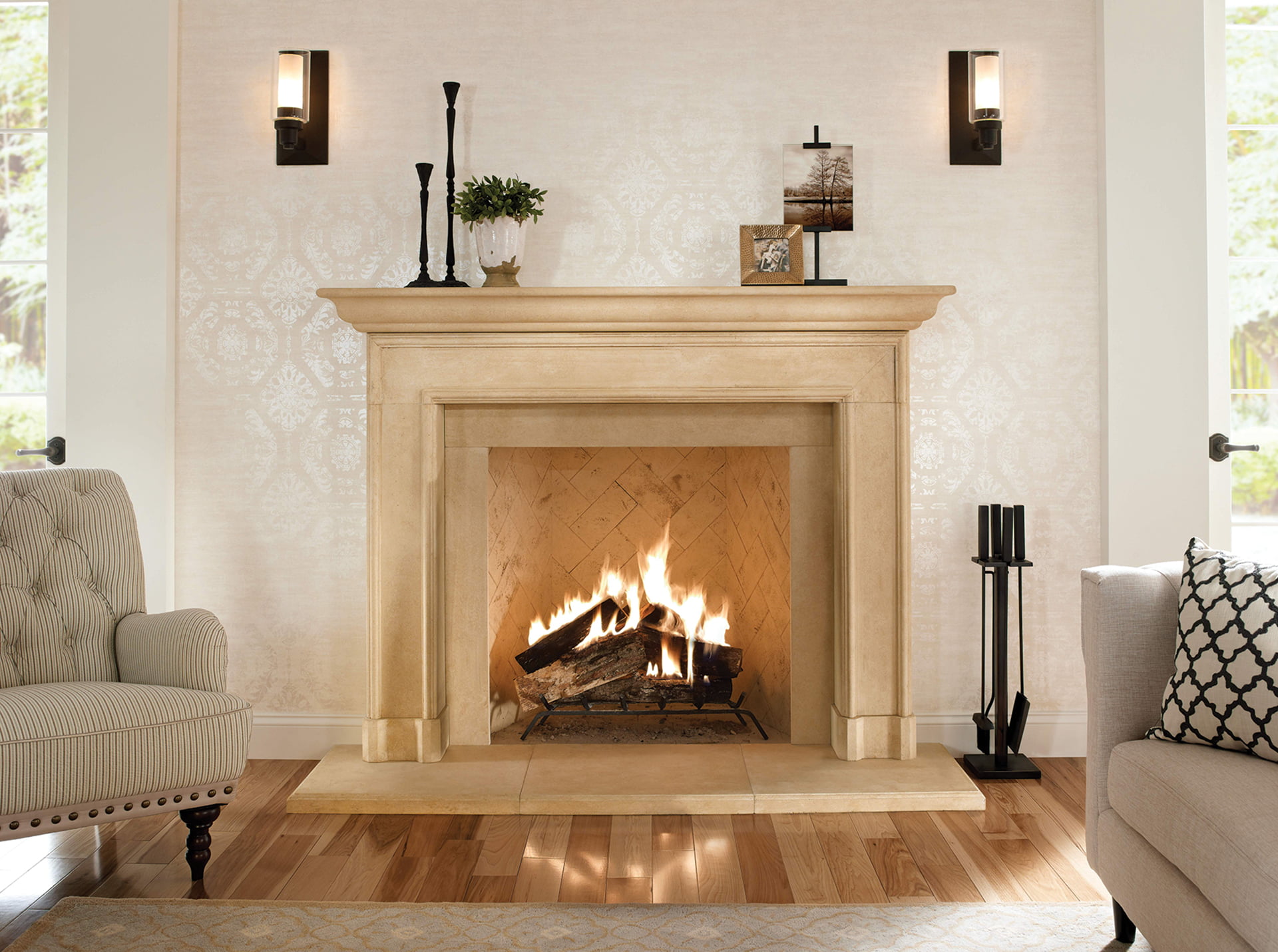 Evoking the look of limestone, Kindred Outdoors & Surrounds’ engineered-stone fireplace surrounds come in four colors and two finishes; the Carmela, with a plinth block foundation and bull nose detailing, is pictured in honed Oak Barrel. mykindredliving.com