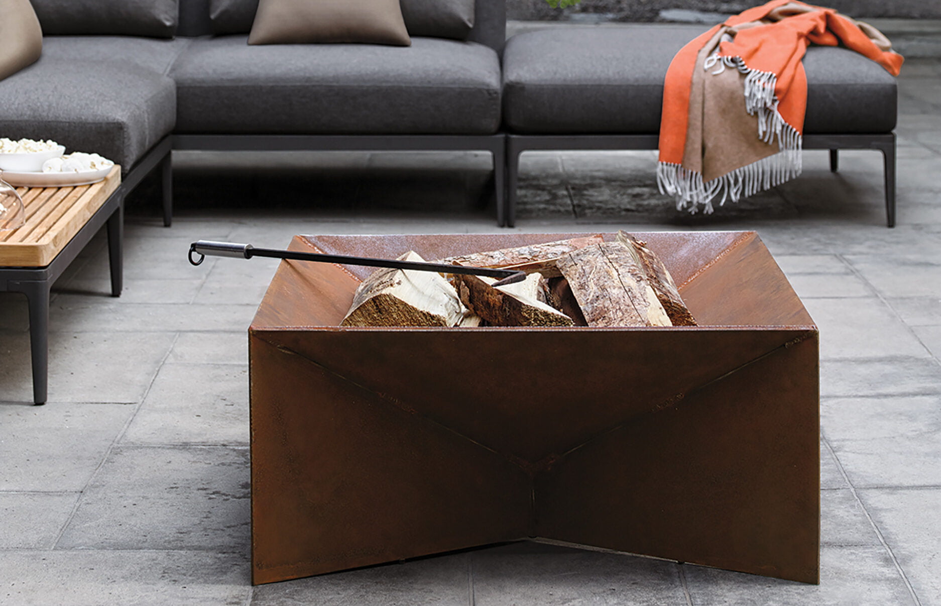 The Plodes Geometric Firepit from Design Within Reach creates a sculptural silhouette. Designed to burn seasoned wood or charcoal, the Corten steel vessel comes in two rectangular sizes; a steel grate and cedar top are sold separately. dwr.com