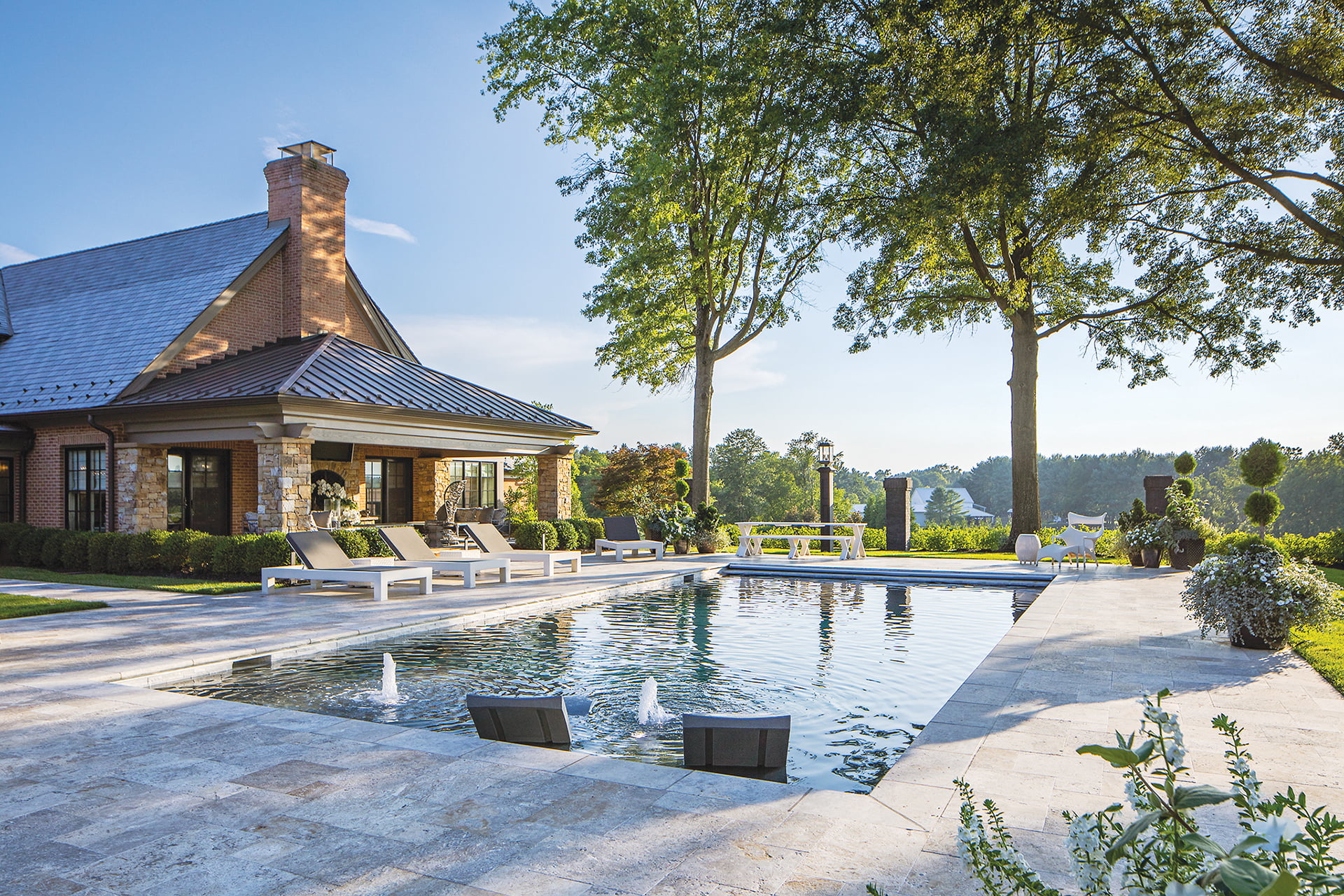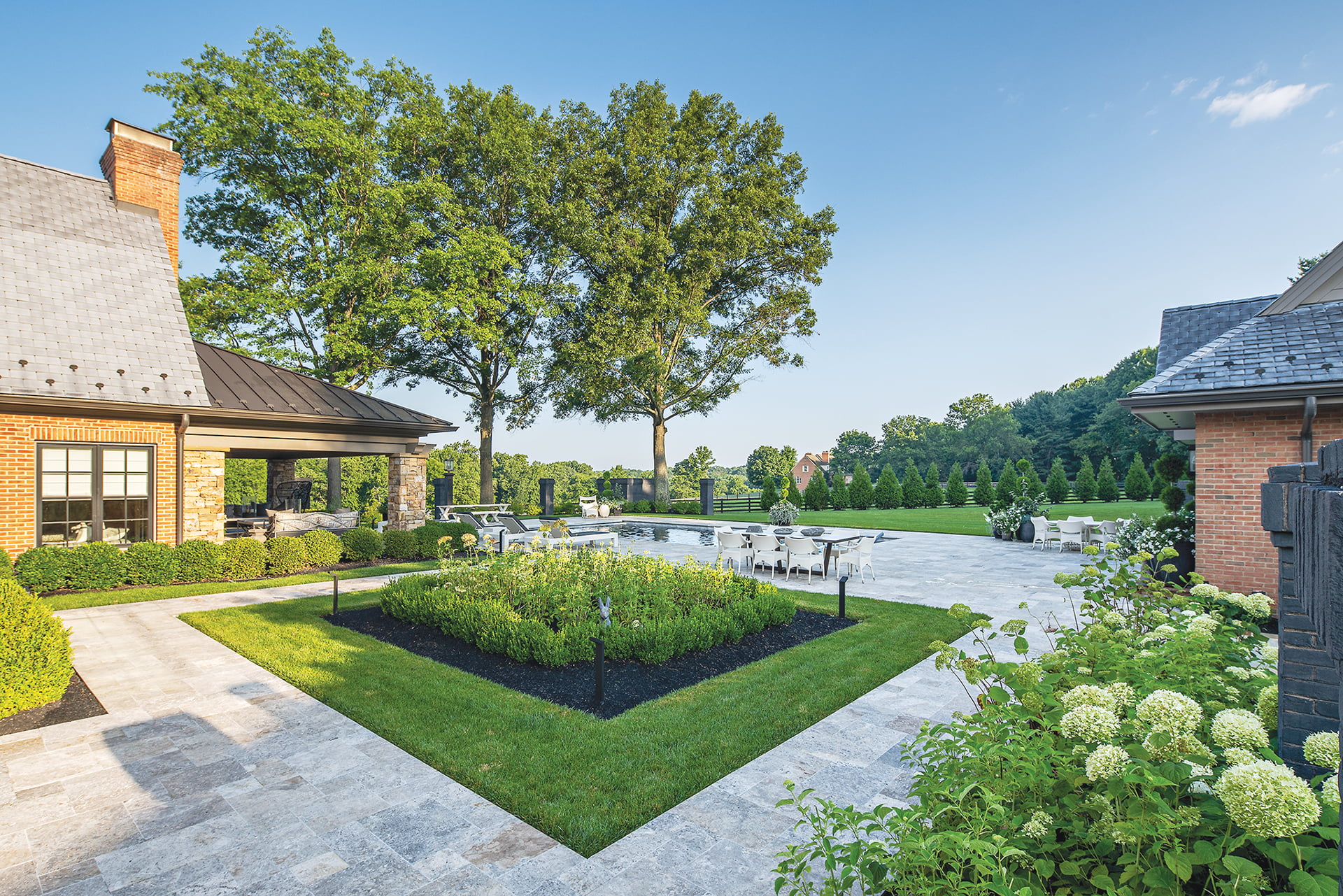 Following a major renovation, the owners of a 20-plus-acre parcel in Clarksville, Maryland, enlisted J&G Landscape Design to reimagine their lackluster front garden to better reflect the look of their elegant home. The team did such a fine job that, four years later, J&G principal Jeff Potter was called back to overhaul the dated backyard.