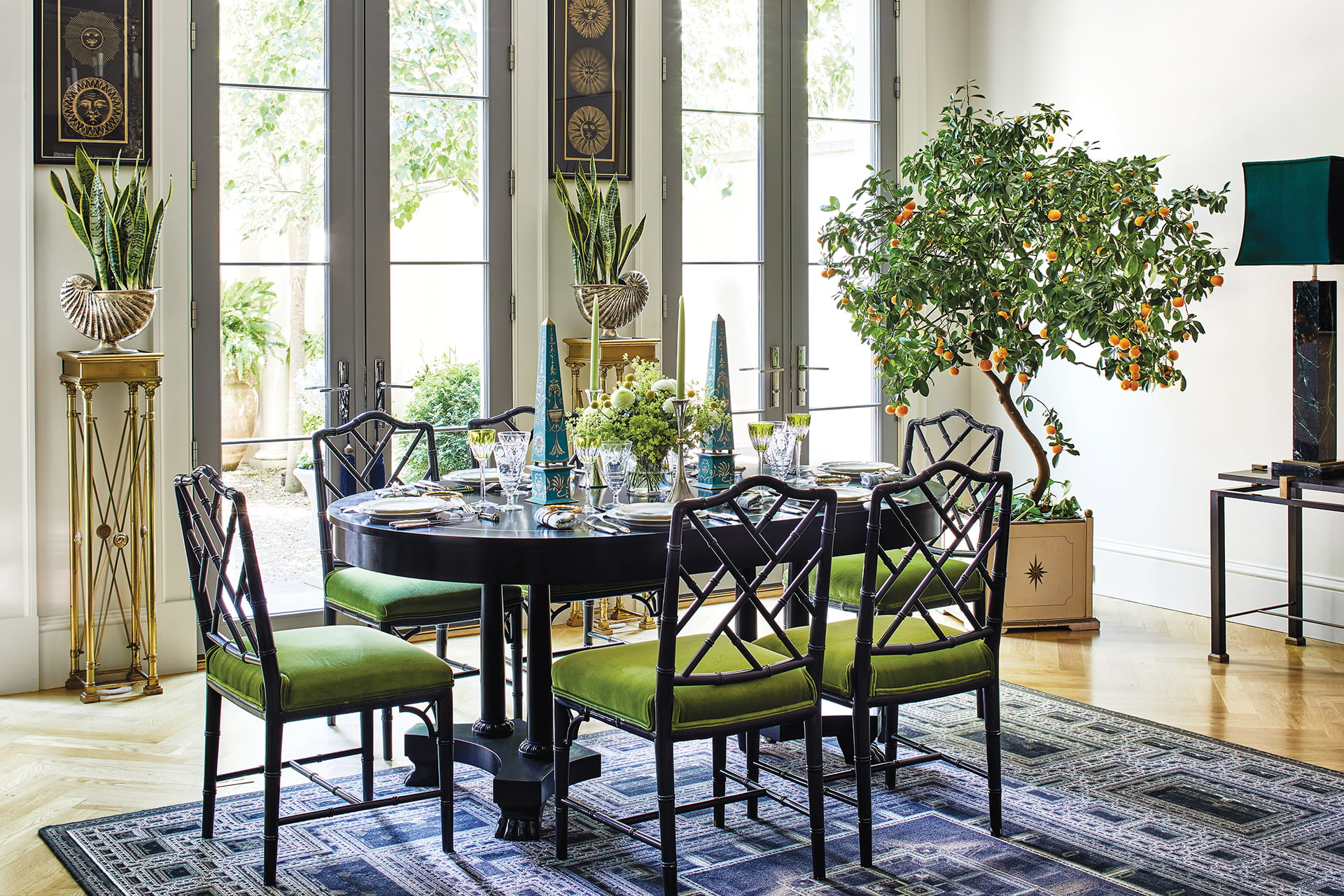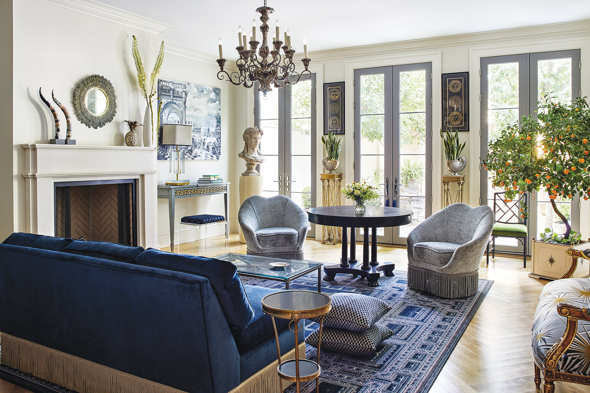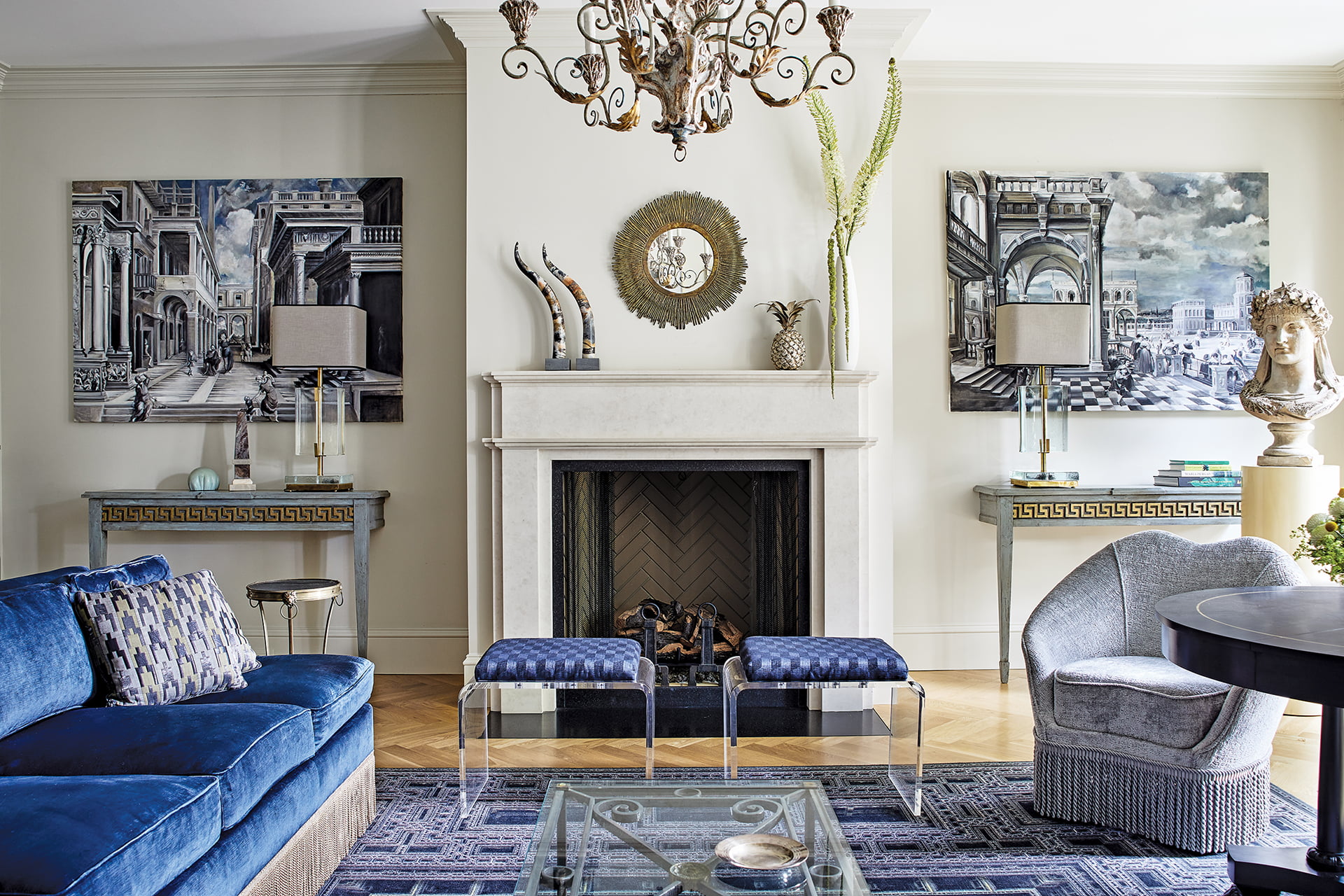 Sofa & Sofa Fabric: kravet.com. Rug: moooicarpets.com. Chair Fabric: jab.de/us. Chair Trim: Stroheim for kravet.com. Coffee Table, Chandelier, Large Round Table & Console Flanking Fireplace: Antique. Art Flanking Fireplace: Custom. Bust: Antique. Art above Stands: fornasetti.com. Bench: Owners’ collection. Tables Flanking Bench: alfonsomarina.com. Art above Bench: Brice Chatenoud. Lucite Stools: Vintage. Bench Fabric: jimthompsonhomefurnishings.com. Mirror: Owners’ collection. Dining Table & Chairs: Owners’ collection. Chair Fabric: Vintage.