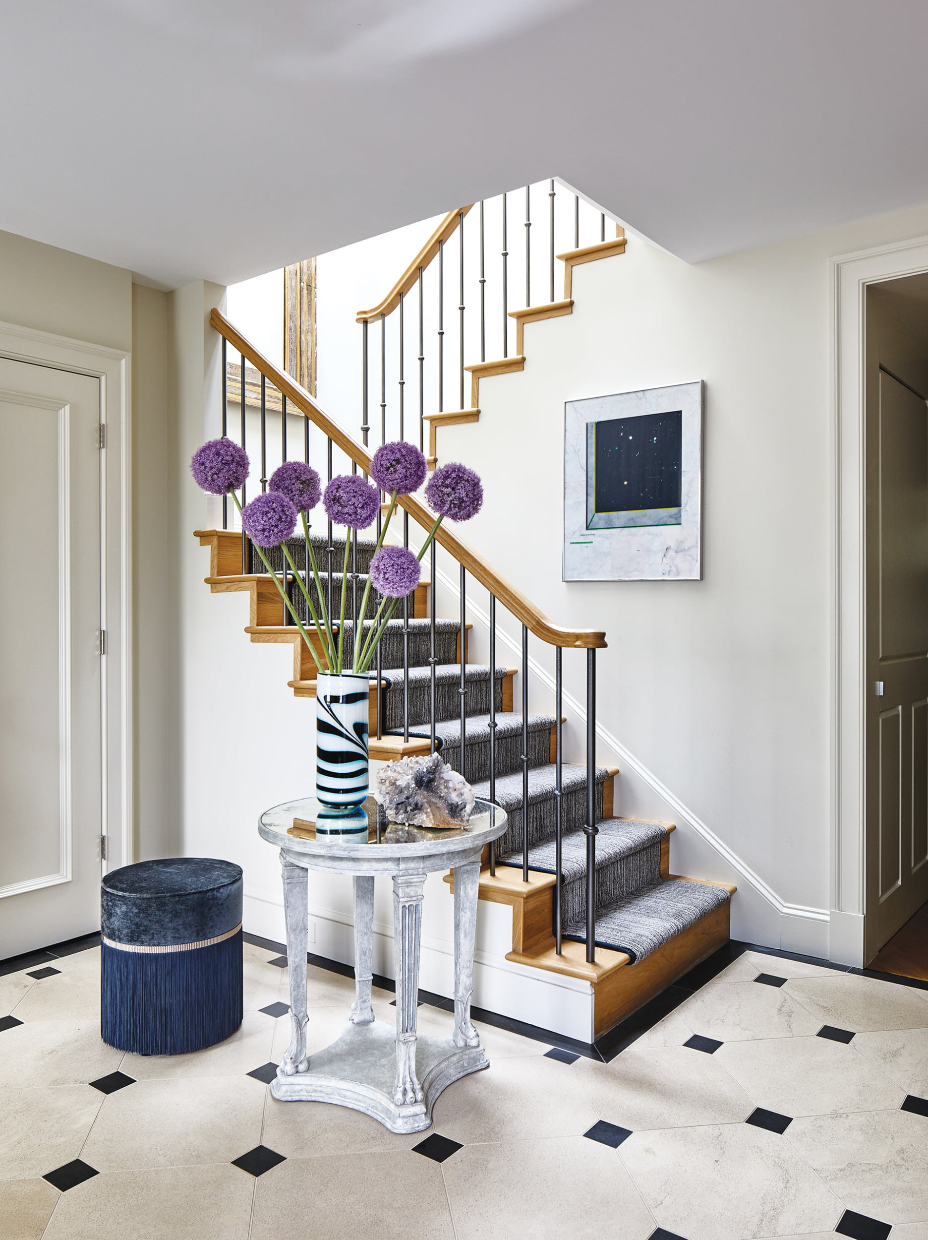 The transatlantic journey begins at the front entry, where a refined gray, black and white palette is established through a limestone tile floor with black diamond inlay. Artwork, an Italian fringed stool and bold purple objets atop an antique-mirrored table enliven the graphic scheme. A graceful switchback staircase leads up to the second-level primary bedroom and a third-floor guest room.