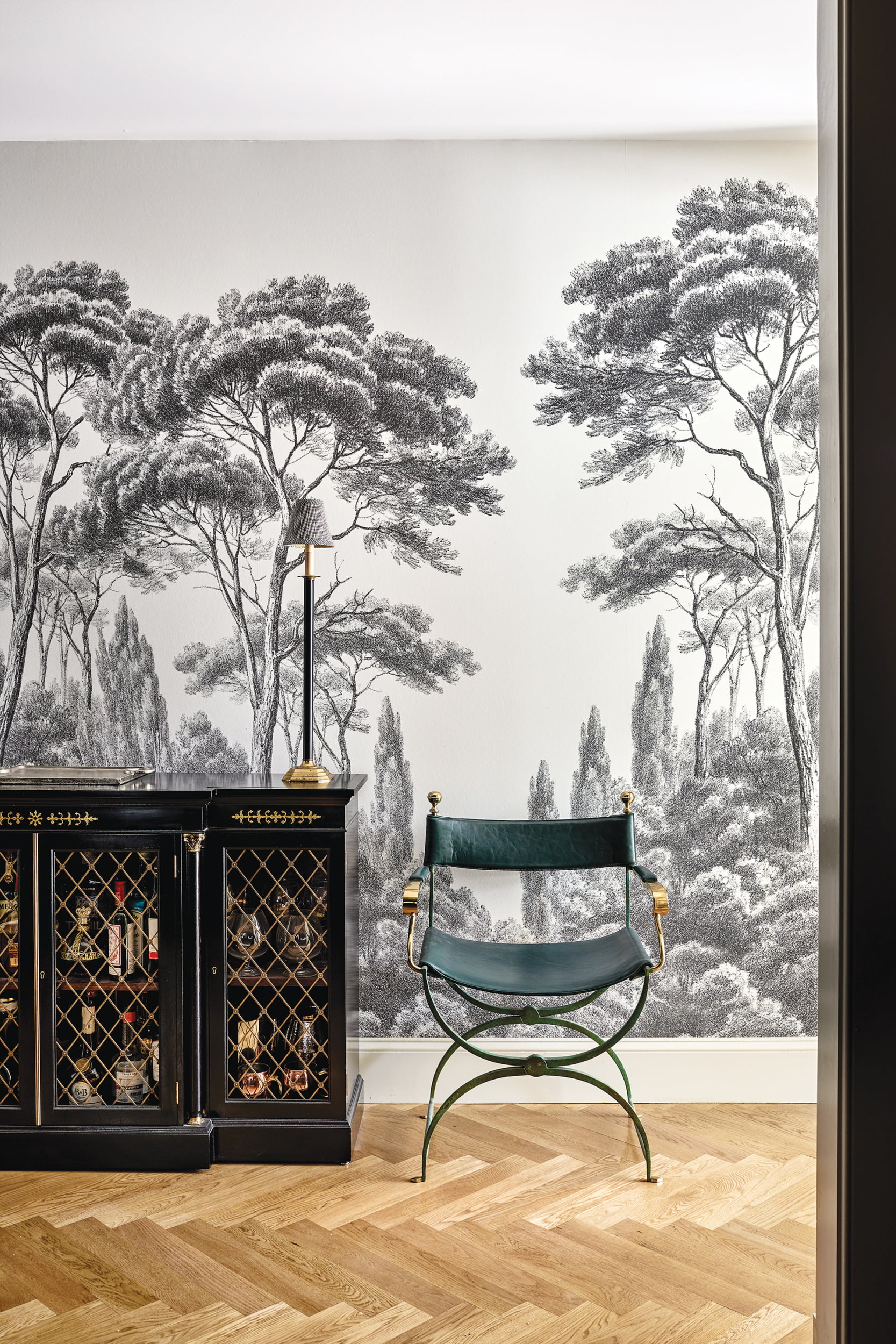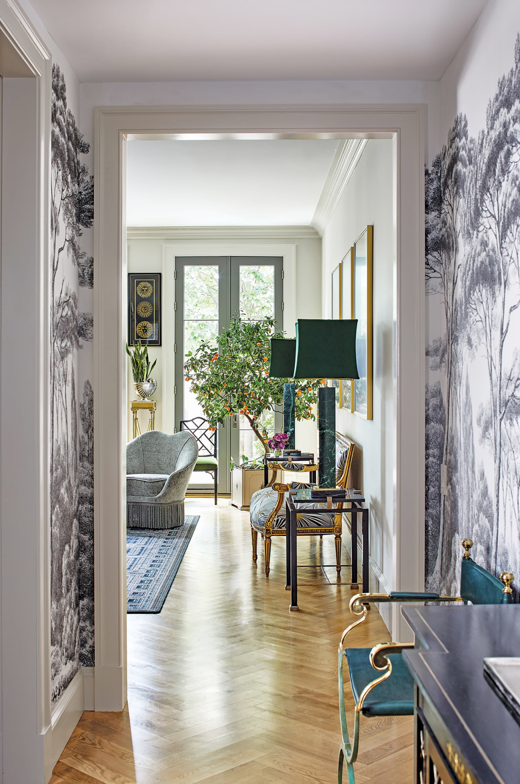 A narrow gallery flows from the foyer back to the salon—an airy, open space spanning the rear of the house and encompassing both living and dining areas. The passageway is offset by graphic, arboreal-patterned grisaille (gray-toned) wall covering with a pastoral theme; it creates a bucolic backdrop for an ebonized, antique bar cabinet and a brass-and-leather director’s chair.