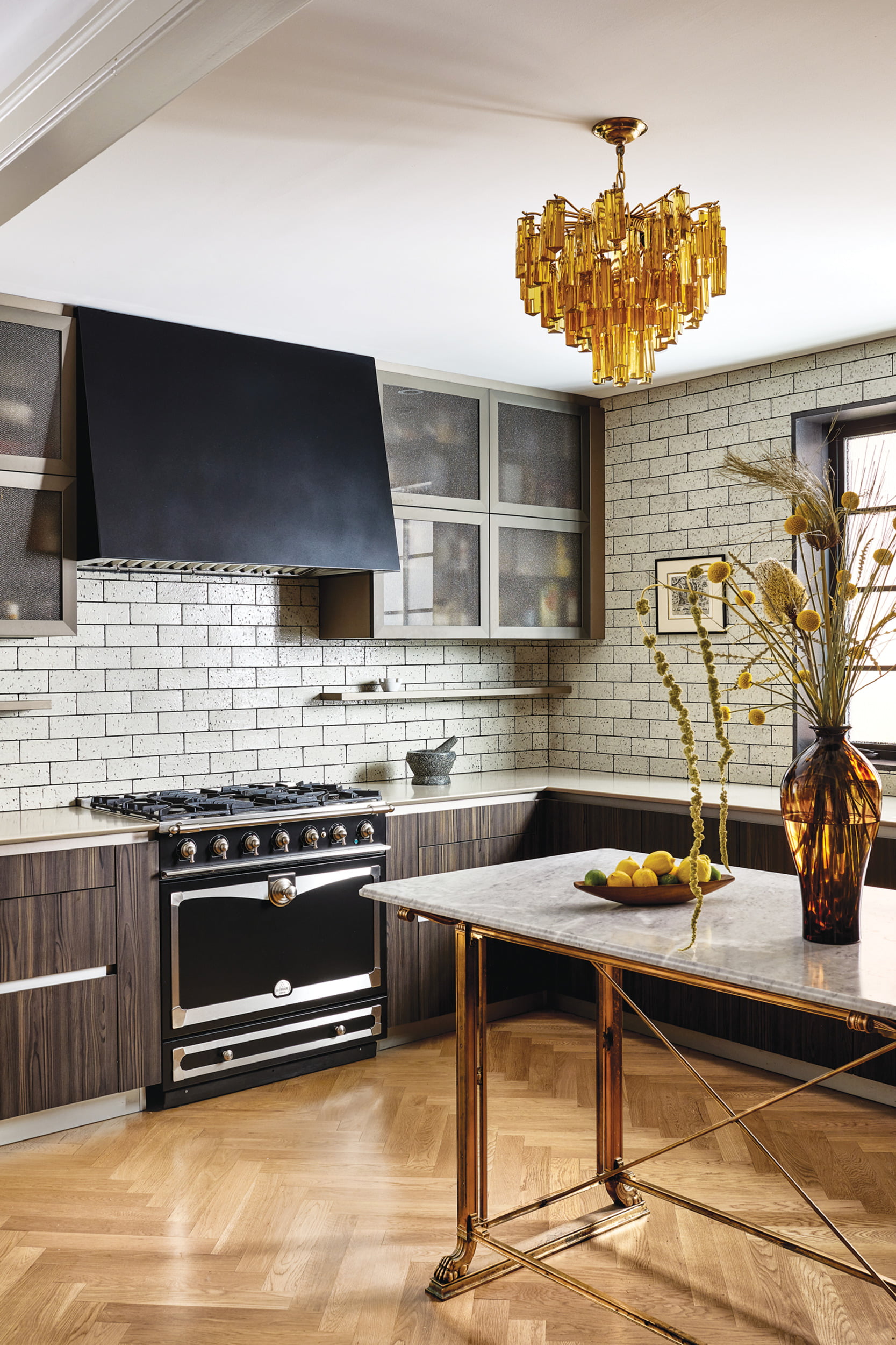 To the left off the gallery, the U-shaped kitchen is a study in glossy gray, glass and warm wood. Snaidero cabinets line the walls while creamy Caesarstone counters and glazed tiles are a soft counterpoint to the sleek cabinetry, La Cornue range and custom-designed steel hood. A marble-topped bronze island—crafted by Baty from an antique bank counter—is the couple’s preferred dining table, whether it’s just à deux or for larger groups. “It’s where we do most of our entertaining,” Jankowski admits.
