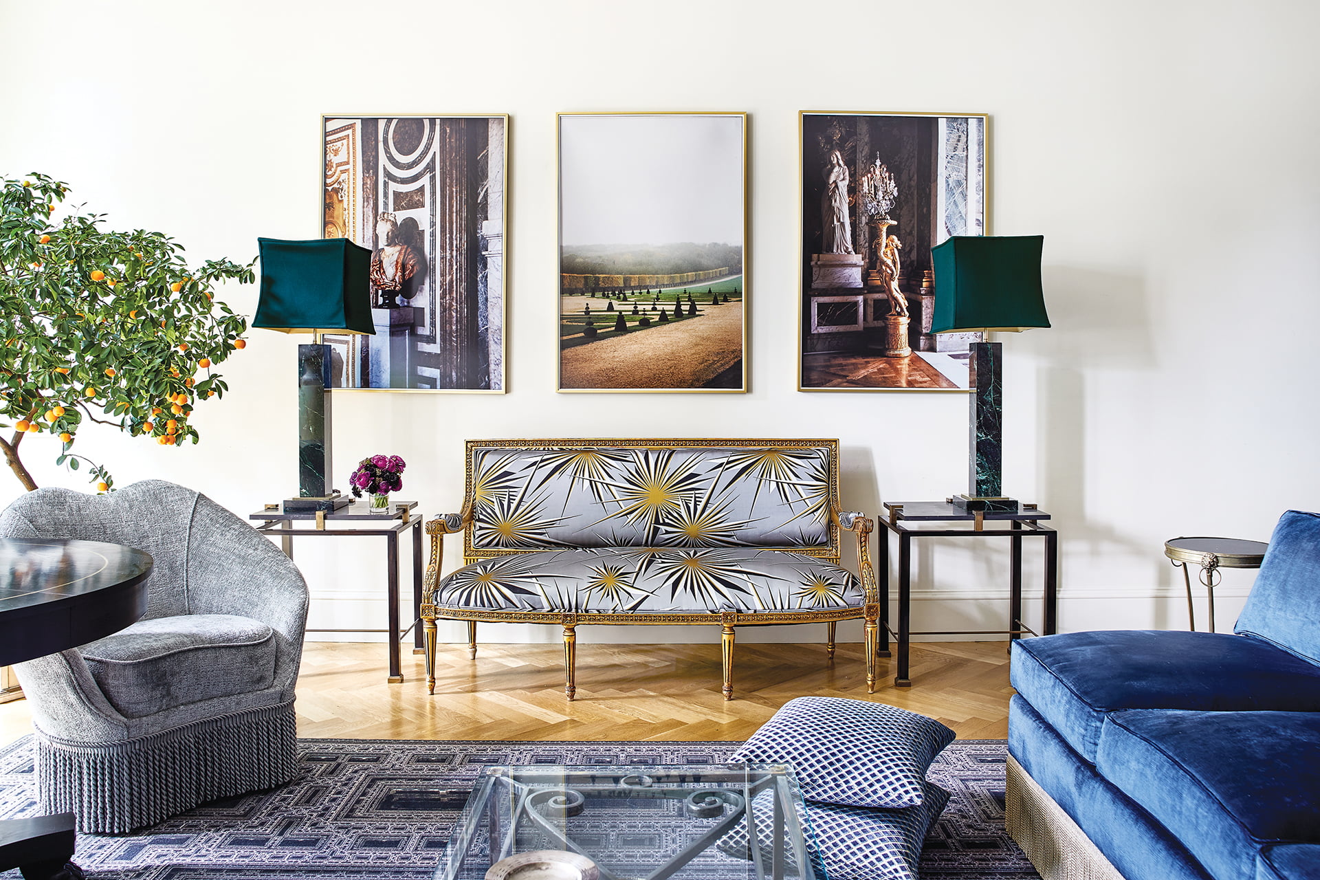 Between the two chairs rests an ebonized Napoleon III-style table that opens to seat six when needed (very rarely, the owners confess). This flexibility, Baty explains, reduces volume and clutter and keeps the sight lines to the garden clear. Large-scale grisaille paintings and a photo triptych of Versailles display classic scenes in modern mediums.