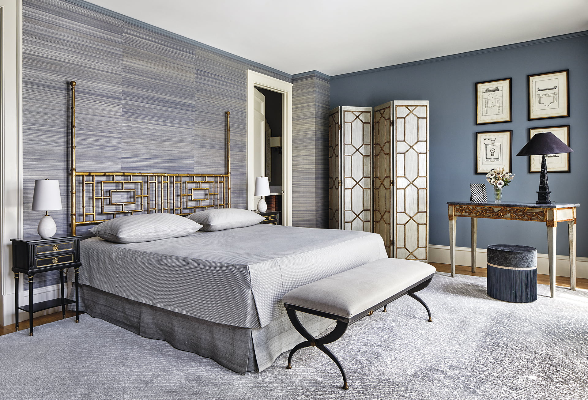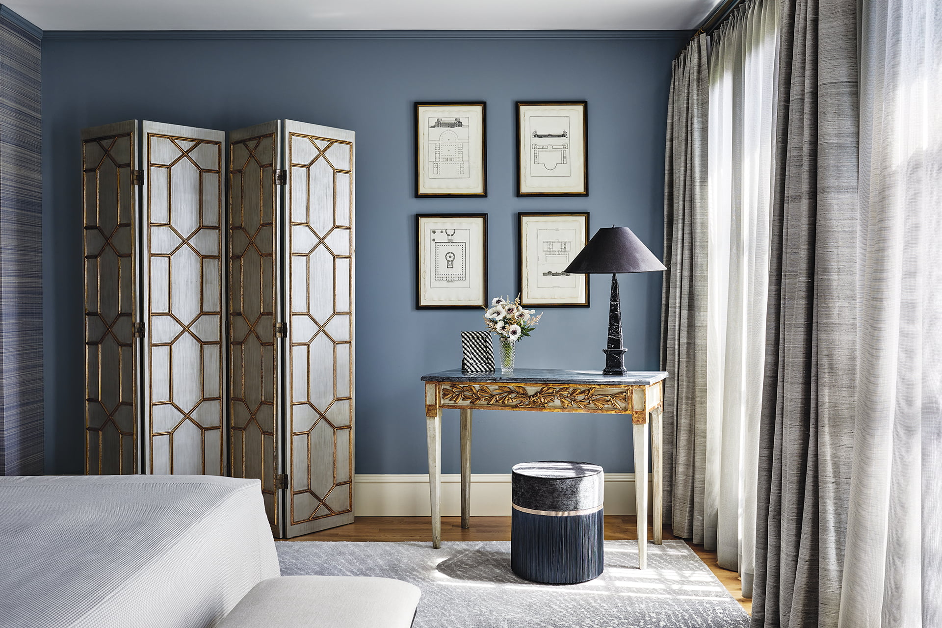 Bedding: ralphlauren.com. Wall Covering: phillipjeffries.com. Rug: nourison.com. Desk Lamp: Vintage. Drapery Fabric: dedar.com. Drapery Fabrication: greatdreamsinteriors.com. Stool: lorenzabozzoli.com. Screen: Antique. Bench: Vintage. Bench Fabric: jab.de./us. Blue Chair Fabric: kravet