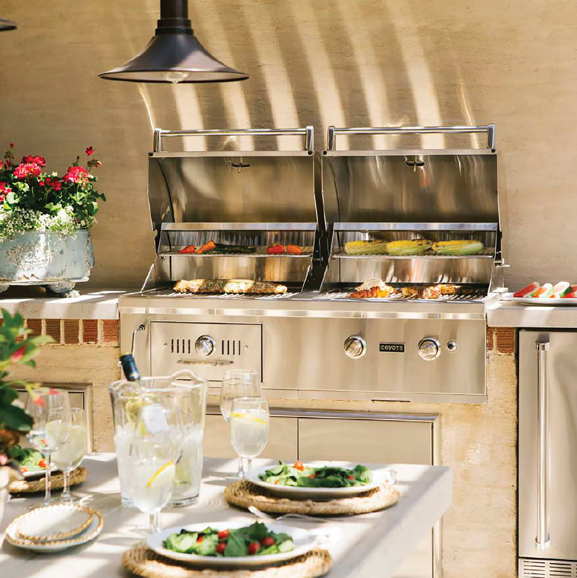 The Coyote 50” Hybrid Built-In Grill is powered by charcoal on one side and gas on the other. Two burners and 1,200 square inches of grilling surface are illuminated by LEDs. Find at Appliance Distributors Unlimited locations. adu.com; coyotegrill.com