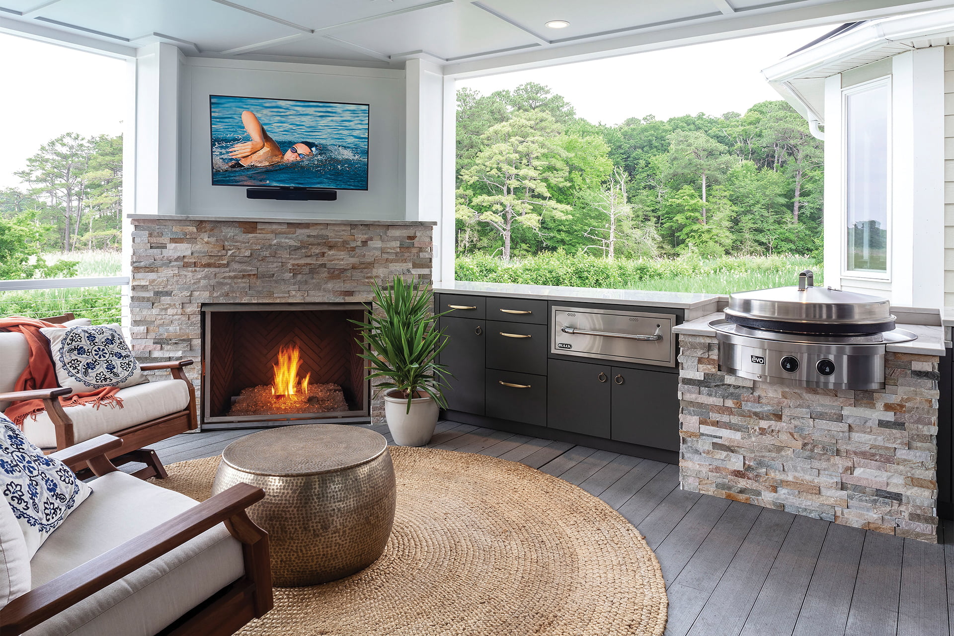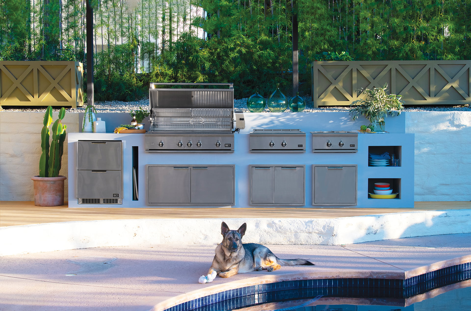 DCS Appliances’ Series 9 Built-In 48-Inch Grill boasts an infrared rotisserie and a charcoal smoker tray. Pictured with 24-inch refrigerator drawers; a griddle powered by natural or LP gas; and stainless-steel cabinets. dcsappliances.com