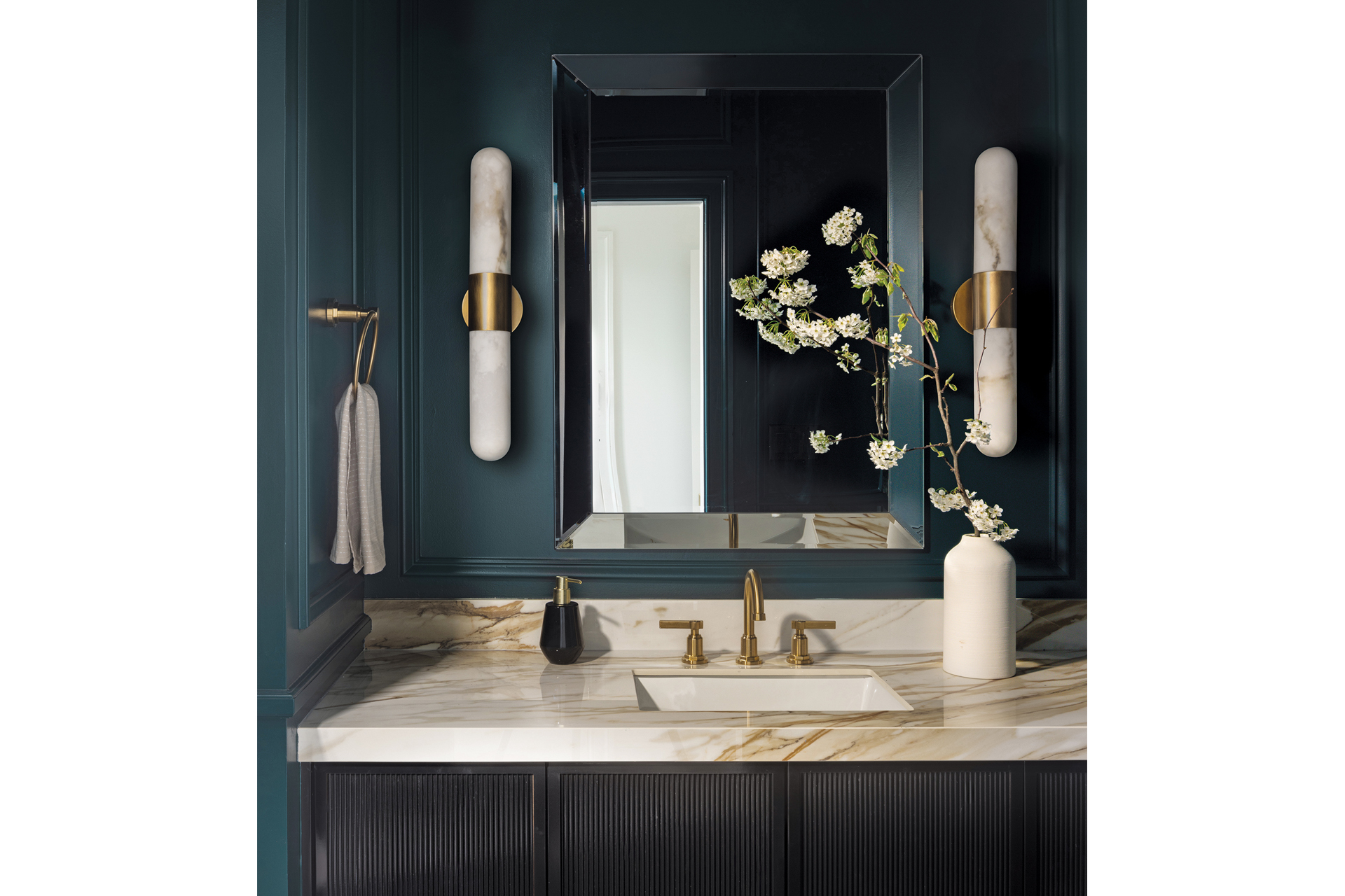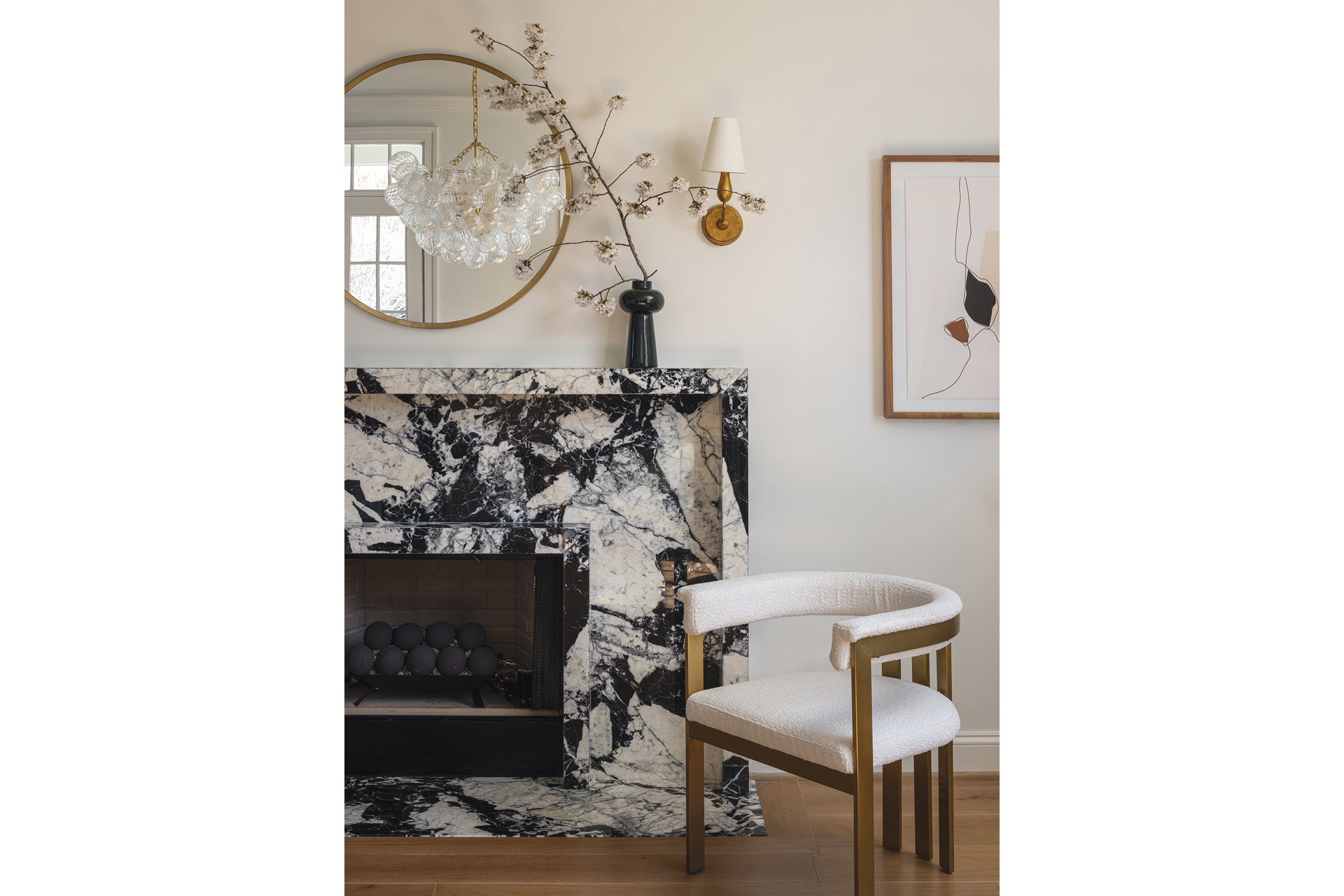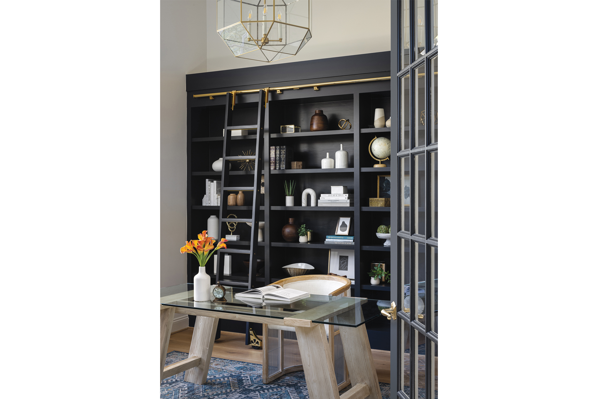 “We viewed the front of the house as entertaining space; the back with the kitchen and family room are more comfortable for daily living,” relates Drakopoulos, who added drama to the living room with an eye-catching, black-and-white marble fireplace surround, plus built-in shelving and cabinetry painted in Sherwin-Williams’ Shiitake.
