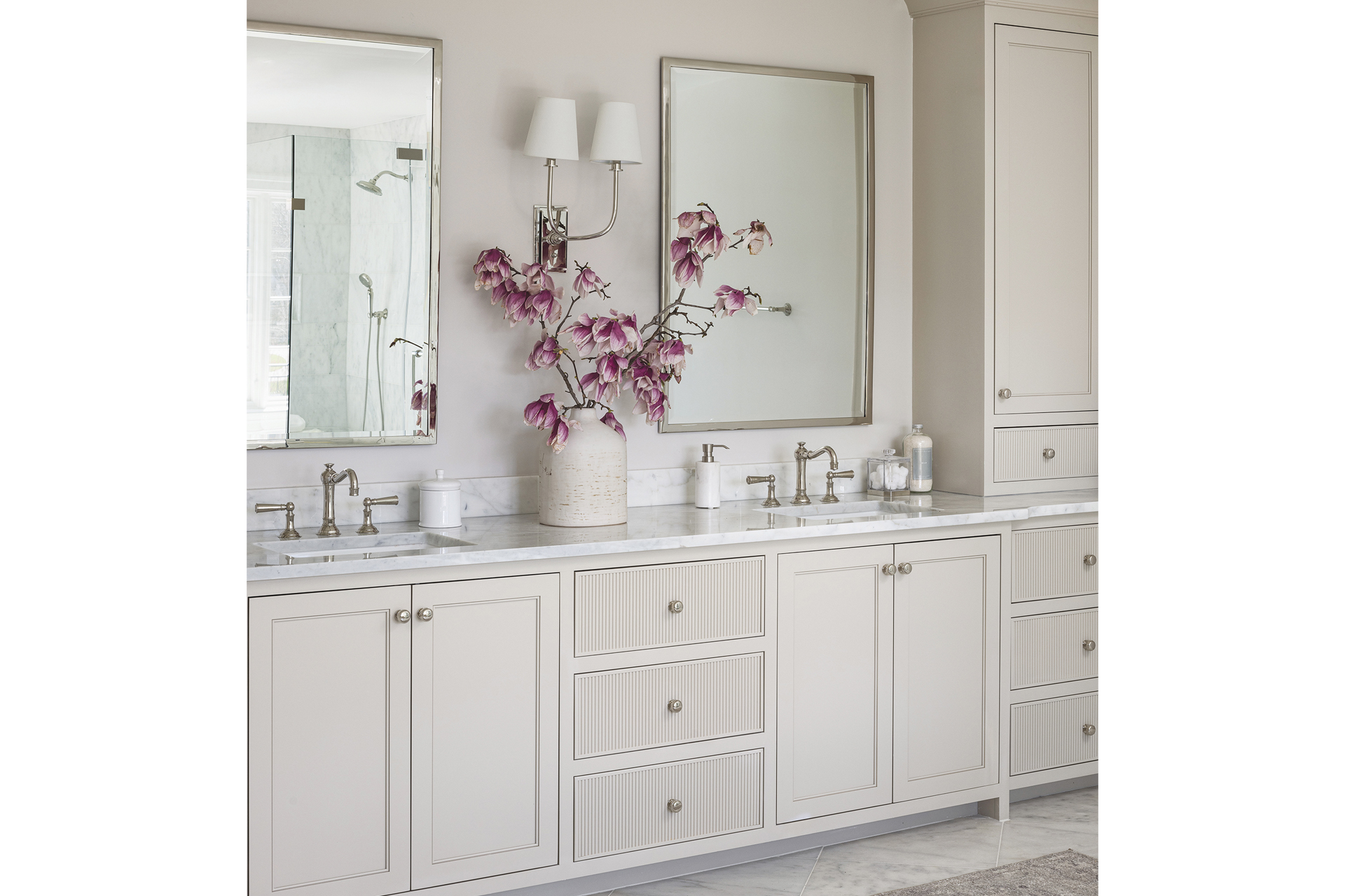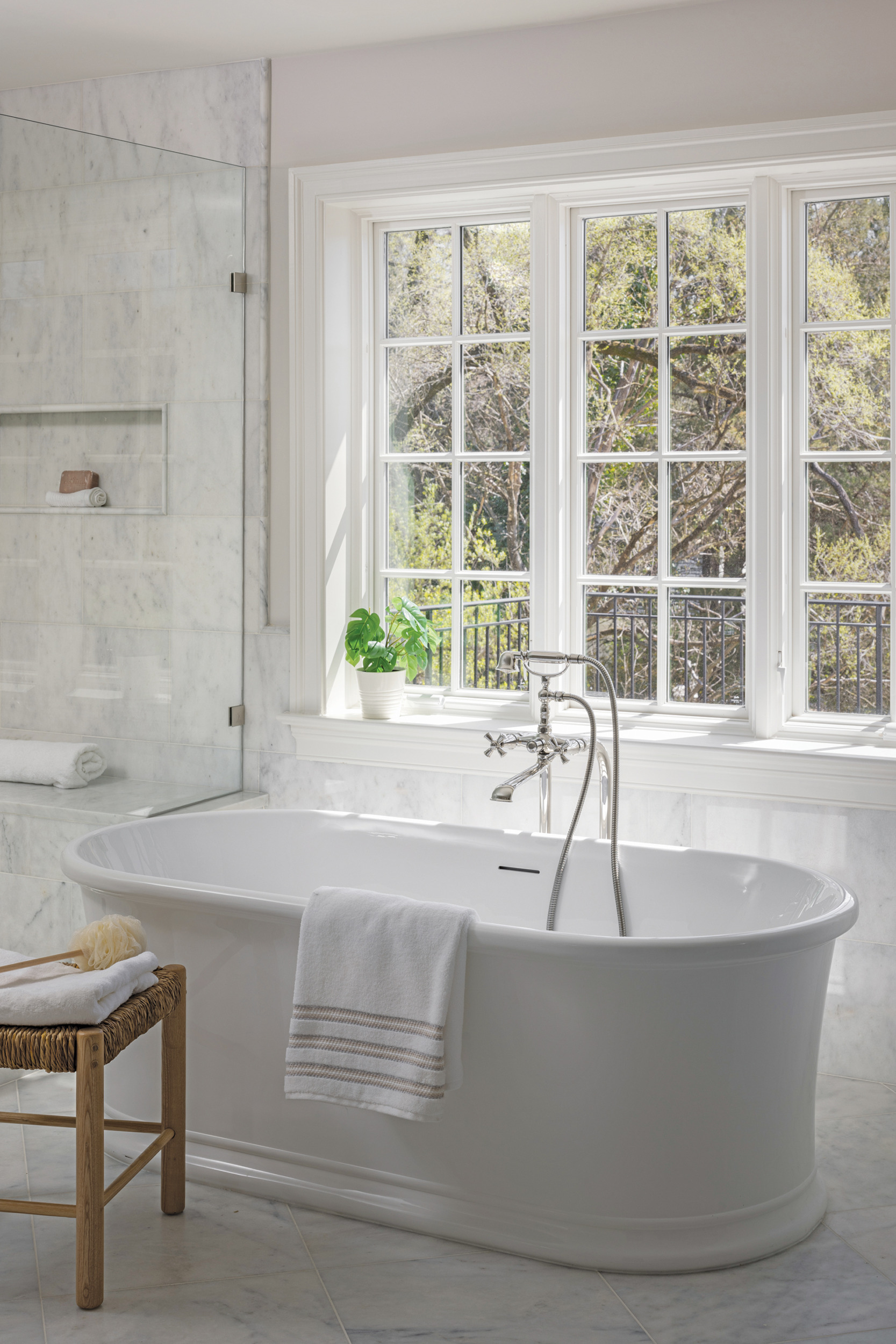 The more casual rear of the house is adorned in natural wood tones. In the large kitchen, wide-plank, white oak floors, an almond-stained white oak island and soft-white cabinetry impart a warm, inviting feel. Upstairs, a clean sweep of the primary bath squared off awkward angles and added artisanal finishes such as marble floors, a freestanding tub and a vanity with reeded drawers.