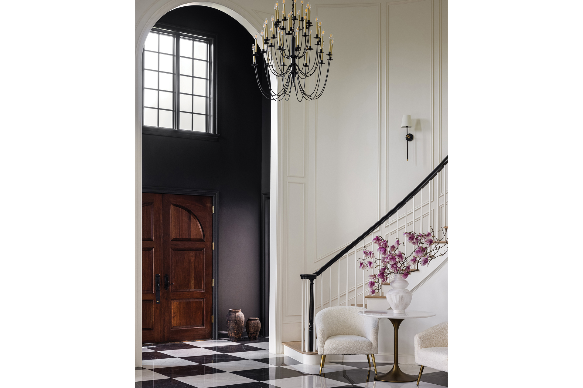 Walls painted an iron-ore hue make a statement in the two-story foyer alcove, which flows into the entry hall. Large-format, black-and-white, marble-look porcelain-tile flooring grounds both spaces. Drakopoulos painted the stair rail in high-gloss black and replaced elaborately detailed iron balusters with simple wood spindles. An ornate crystal-and-faux-brass light fixture made way for a well-scaled chandelier of curvy, black-painted iron.