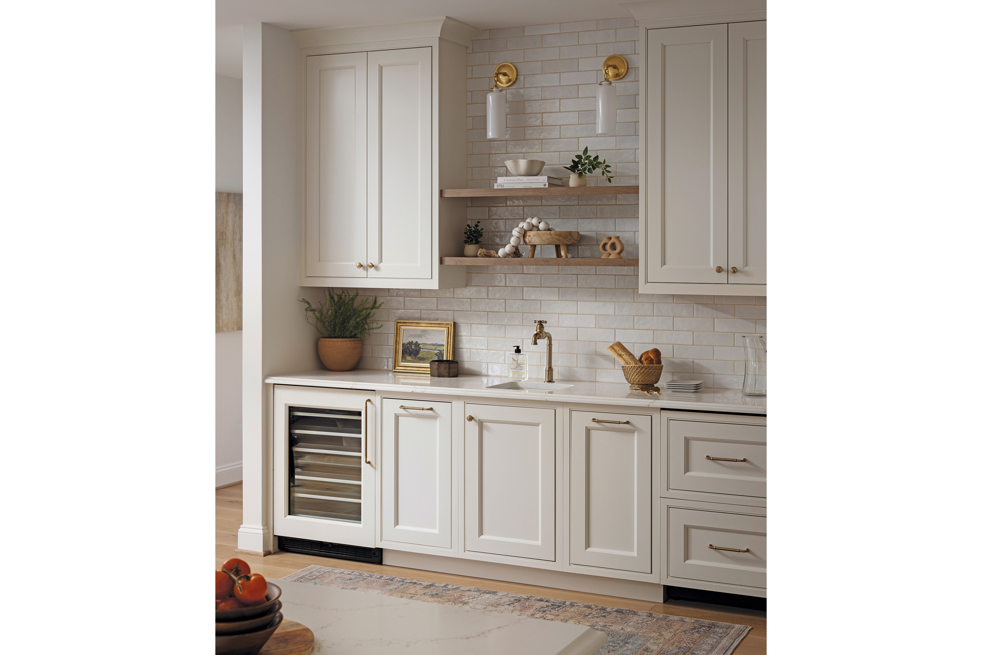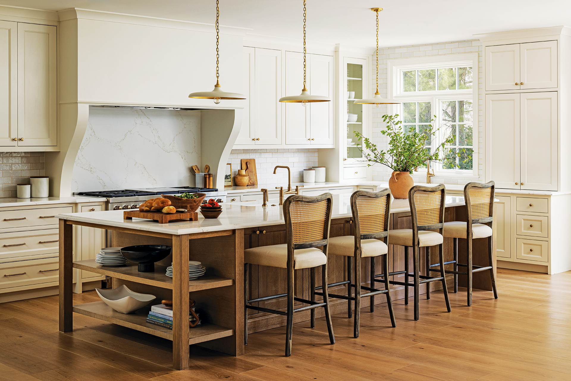 The new kitchen centers on a straightened and slightly enlarged island embellished with open wood shelving. Shiloh cabinetry painted in soft white is paired with marble-look quartz countertops and backsplash.