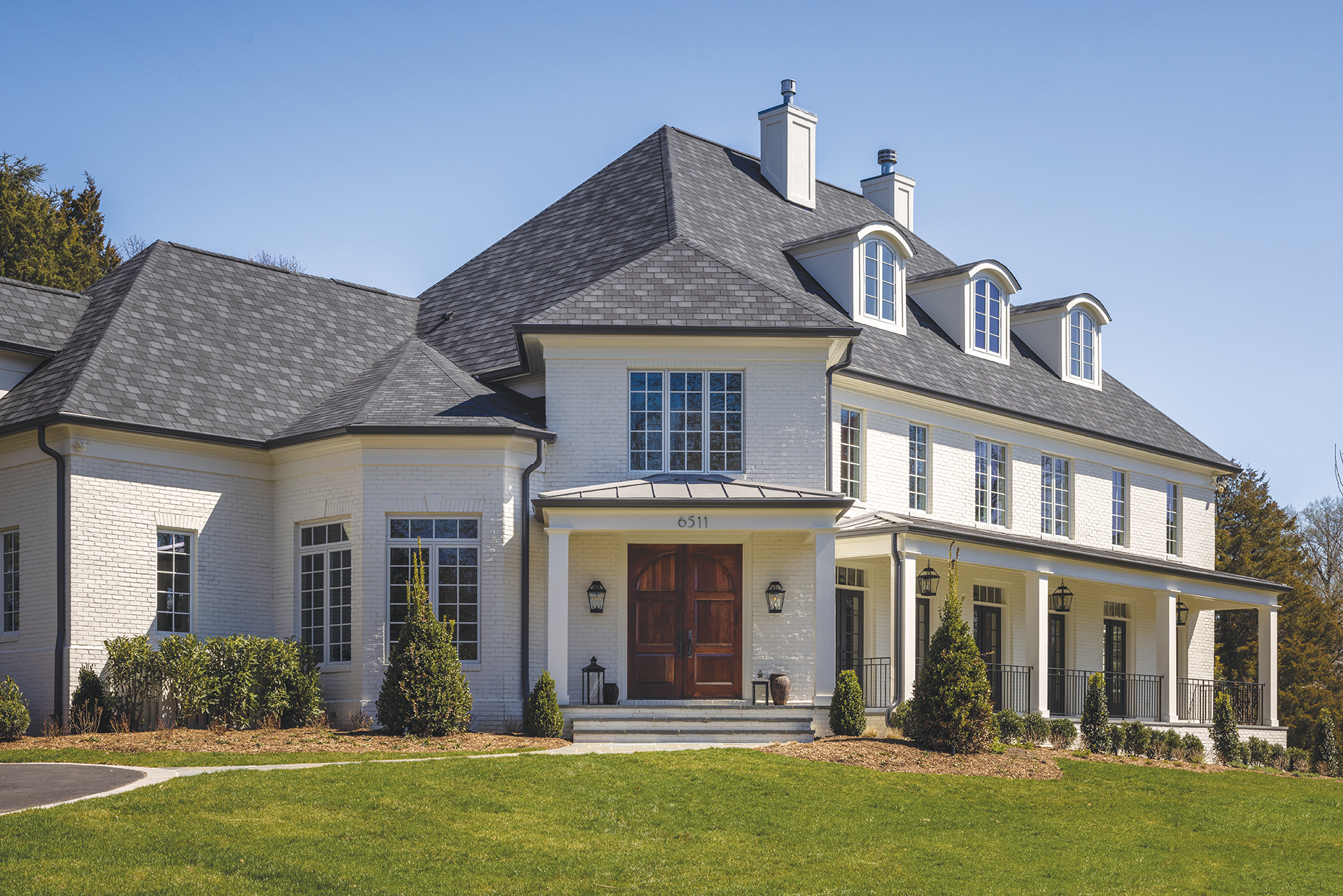 Next, the architect worked to reduce the home’s perceived scale. She designed a single-story entry portico and switched out the Palladian window for a square one with better proportions. The arched roofline above it was flattened and angled to tie in with the existing roof forms. A sweeping, one-story porch added dimension to the long side elevation.