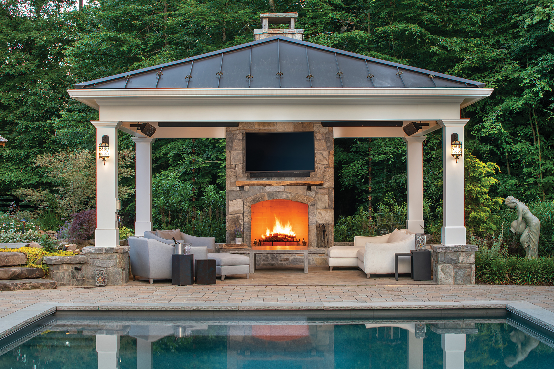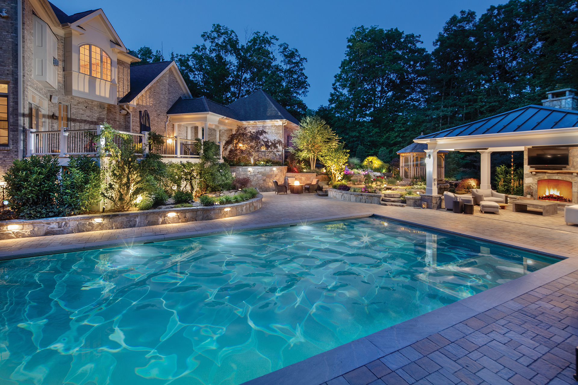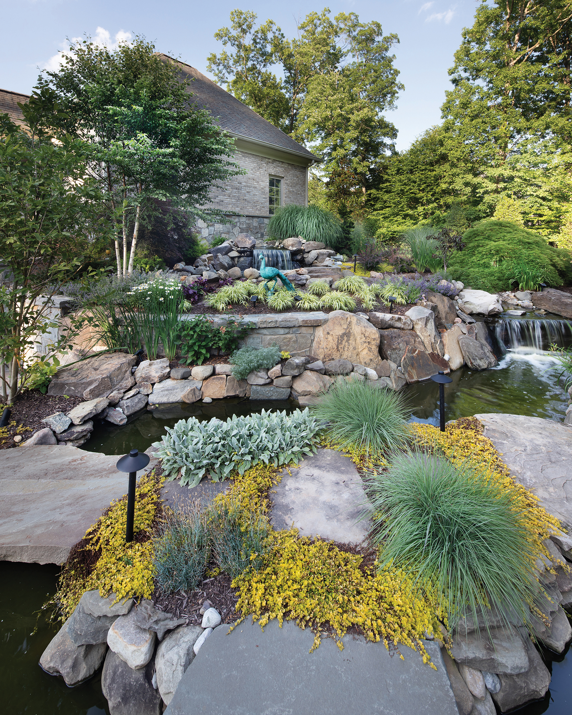 Kane Landscapes turned a challenging property with multiple grade changes to advantage, reinventing the lot as a picturesque, terraced landscape with waterfalls and a winding, 850-square-foot koi pond at its center. Adjacent to this elaborate water feature, a swimming pool with a paver deck is anchored by a pavilion equipped with a stone fireplace. A floating gazebo and islands are connected by natural boulder slabs to the main patio.
