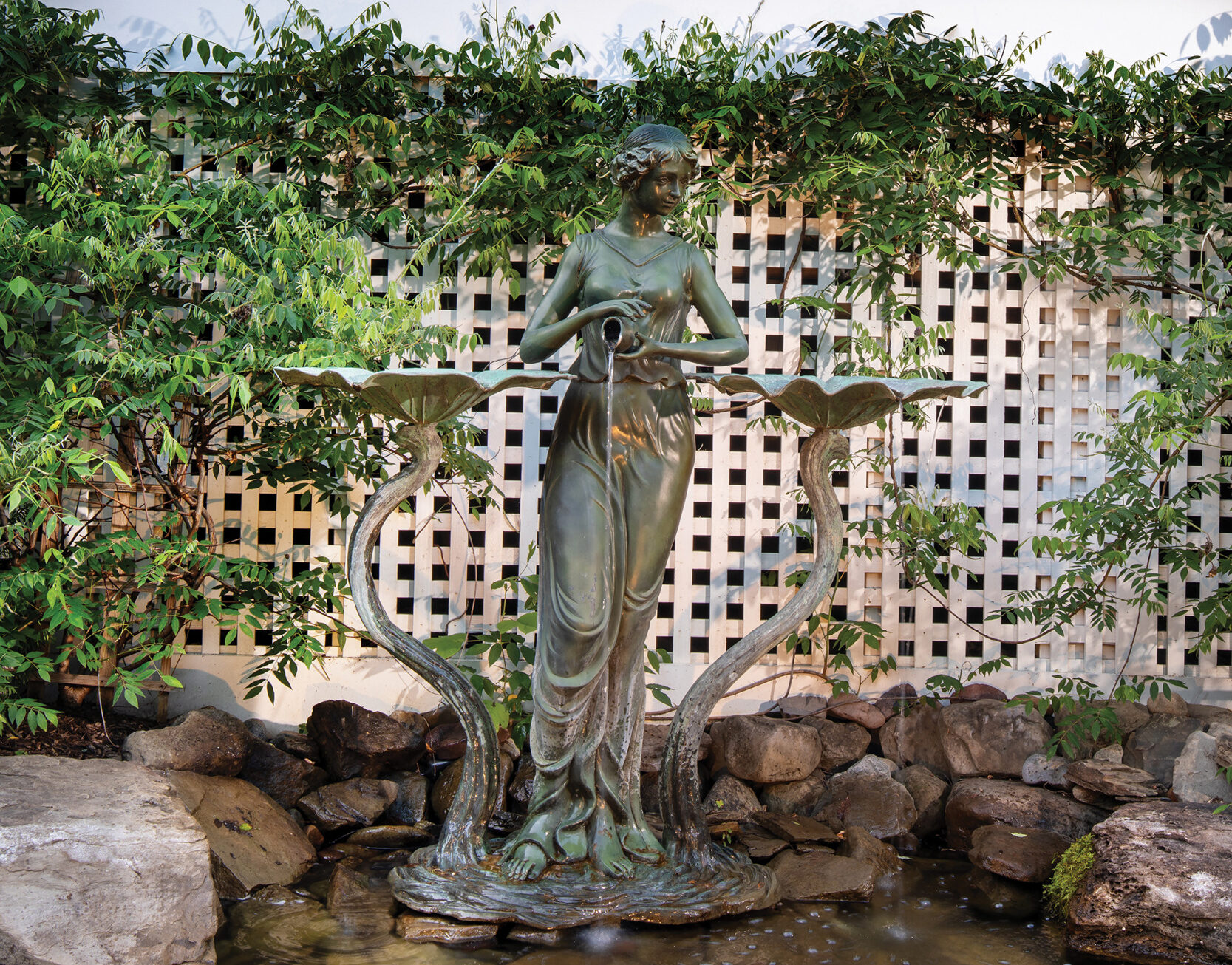Rustic boulder steps blend seamlessly with the pool pavers and make navigating the landscape easy. Patios bordered by stone walls and built-in seating promote easy enjoyment of the environment. In the gardens, lush plantings, including specimen species, provide color and texture and attract wildlife. A careful lighting plan enhances the space.