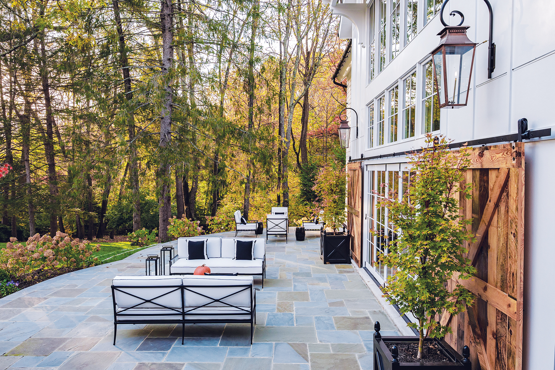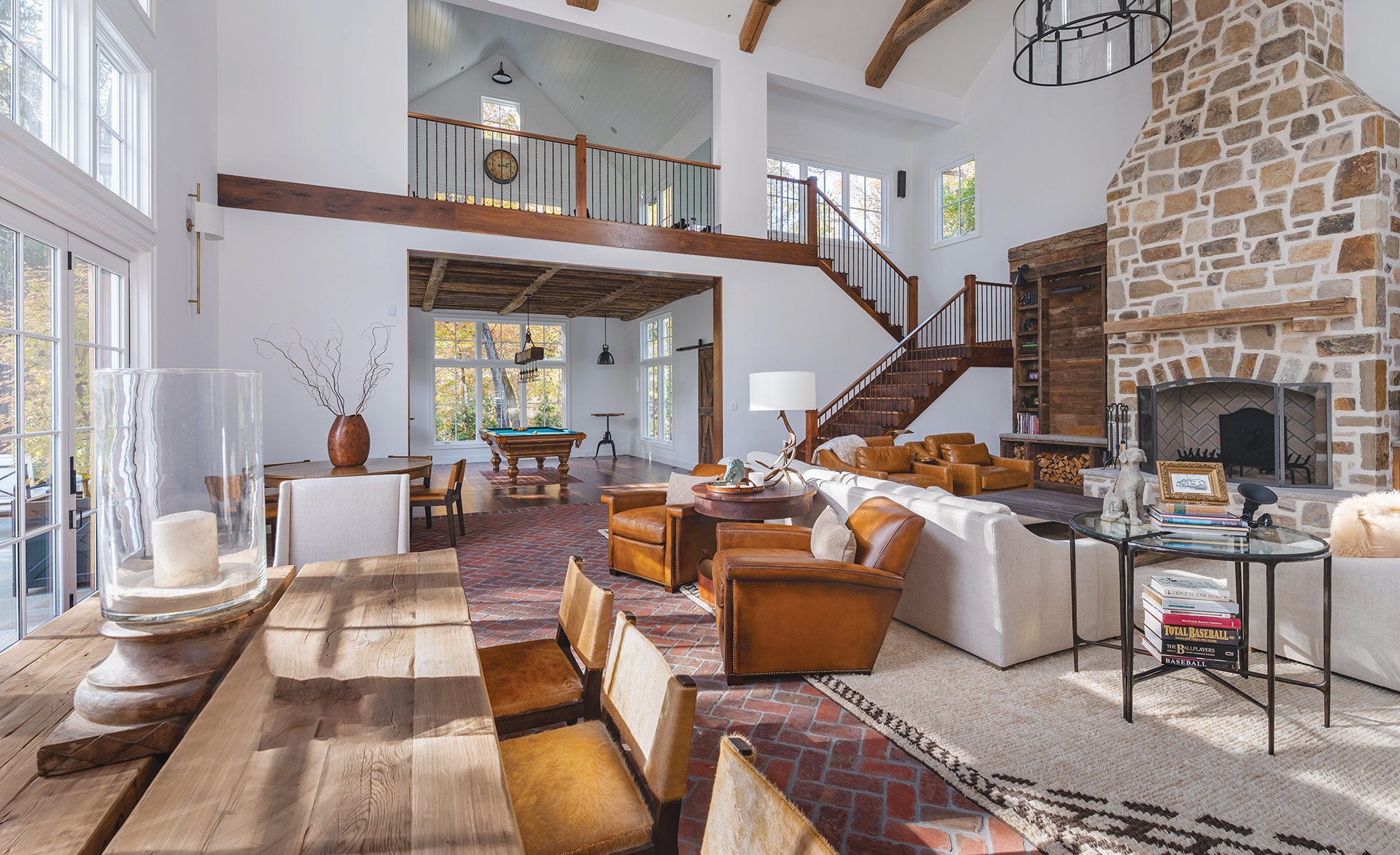 “Because it had barely functional plumbing and wasn’t heated or cooled, it wasn’t a good hangout place for gatherings,” relays architect Eric Carle, who was tapped to replace it with a new addition that would connect to the existing garage. On the now-complete exterior, white lap siding visually ties all of the buildings together, while board-and-batten paneling, barn doors and gas lanterns lend a farmhouse vibe. Inside, a soaring double-height space contains a bar, multiple seating areas and a billiards room with an exercise loft upstairs. Interior designer Stacey Saidy, a longtime friend of the family, evoked a traditional English Country aesthetic with rustic finishes and cozy furnishings. Says Saidy, “It’s an open, airy enclave that provides them the flexibility to scale the space for intimate gatherings and large-scale celebrations alike.”