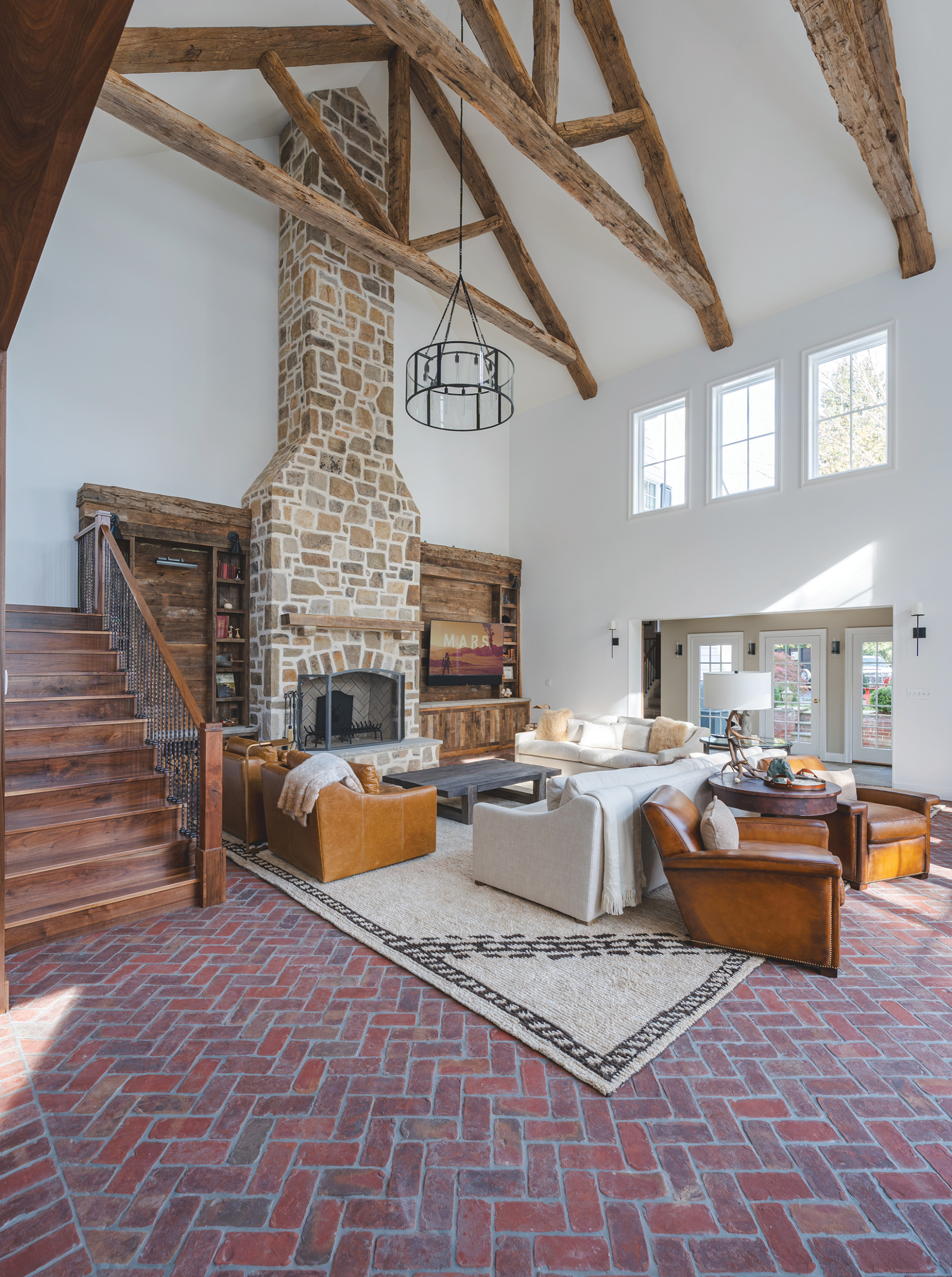 A custom-designed stone fireplace, vintage chestnut beams and brick veneer flooring lend bucolic charm to the interior.